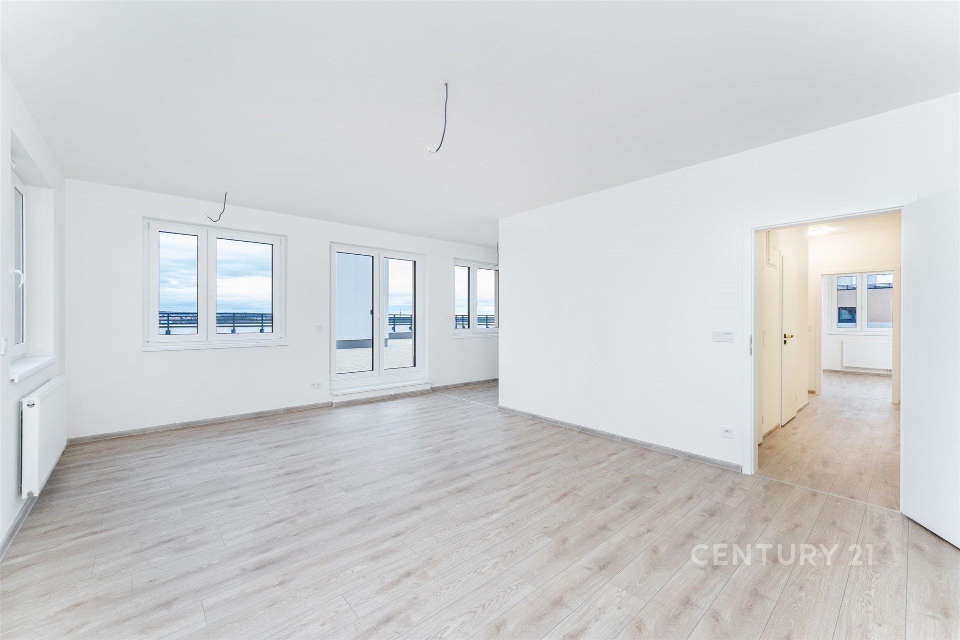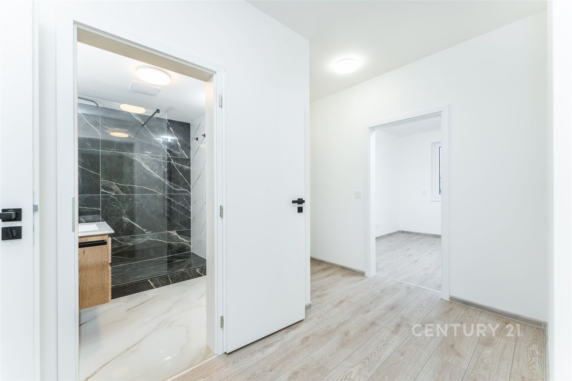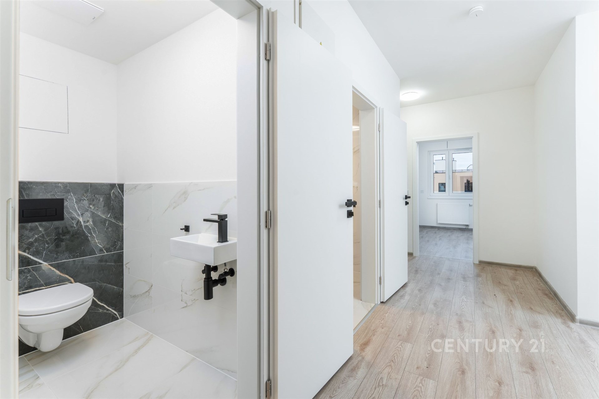 Interiér bytu o ploše cca 77 m² je připraven k dokončení podle vašeho vkusu. Byt se prodává nezařízený, což vám dává svobodu zvolit si kuchyňskou linku a nábytek přesně na míru vašim představám (přiložené vizualizace slouží pro inspiraci). Jedinou kompletně dokončenou částí je designová koupelna a samostatná toaleta, které jsou provedeny ve vysokém standardu s moderními obklady a černými armaturami.