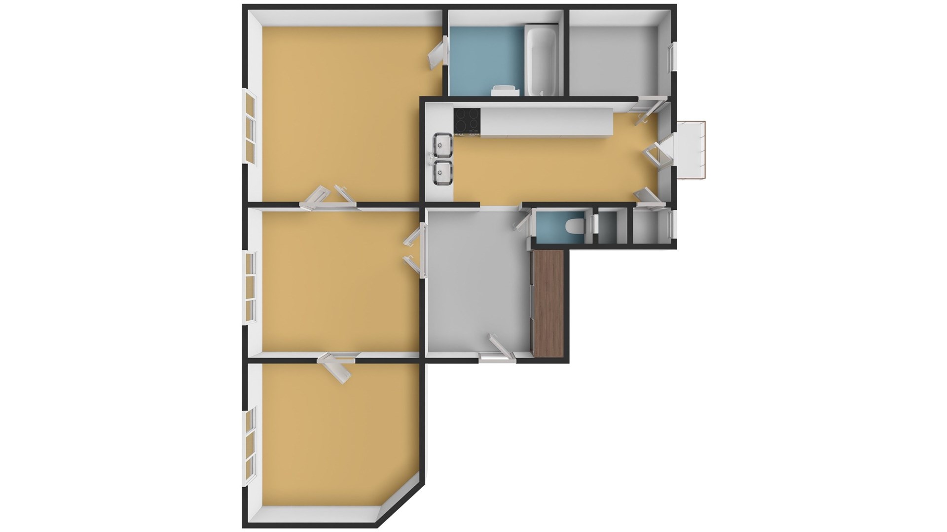 Interiér bytu tvoří prostorný obývací pokoj, tři samostatné pokoje, kuchyně, koupelna a oddělené WC. Kuchyň je vybavena plynovým sporákem a troubou, což umožňuje pohodlné vaření pro celou rodinu. Byt je nabízen nezařízený, což dává novým nájemníkům možnost zařídit si prostor podle vlastních představ. K bytu náleží také sklep, který poskytuje další úložný prostor.