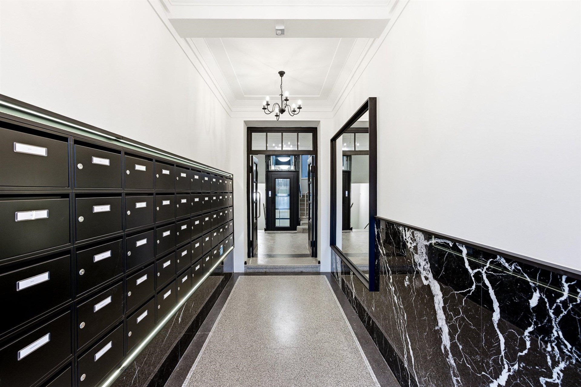 - Ve spolcích mramorové obklady, designové osvětlení z broušeného skla, nový prosklený výtah, schránky a bezpečnostní dveře z dubového dřeva