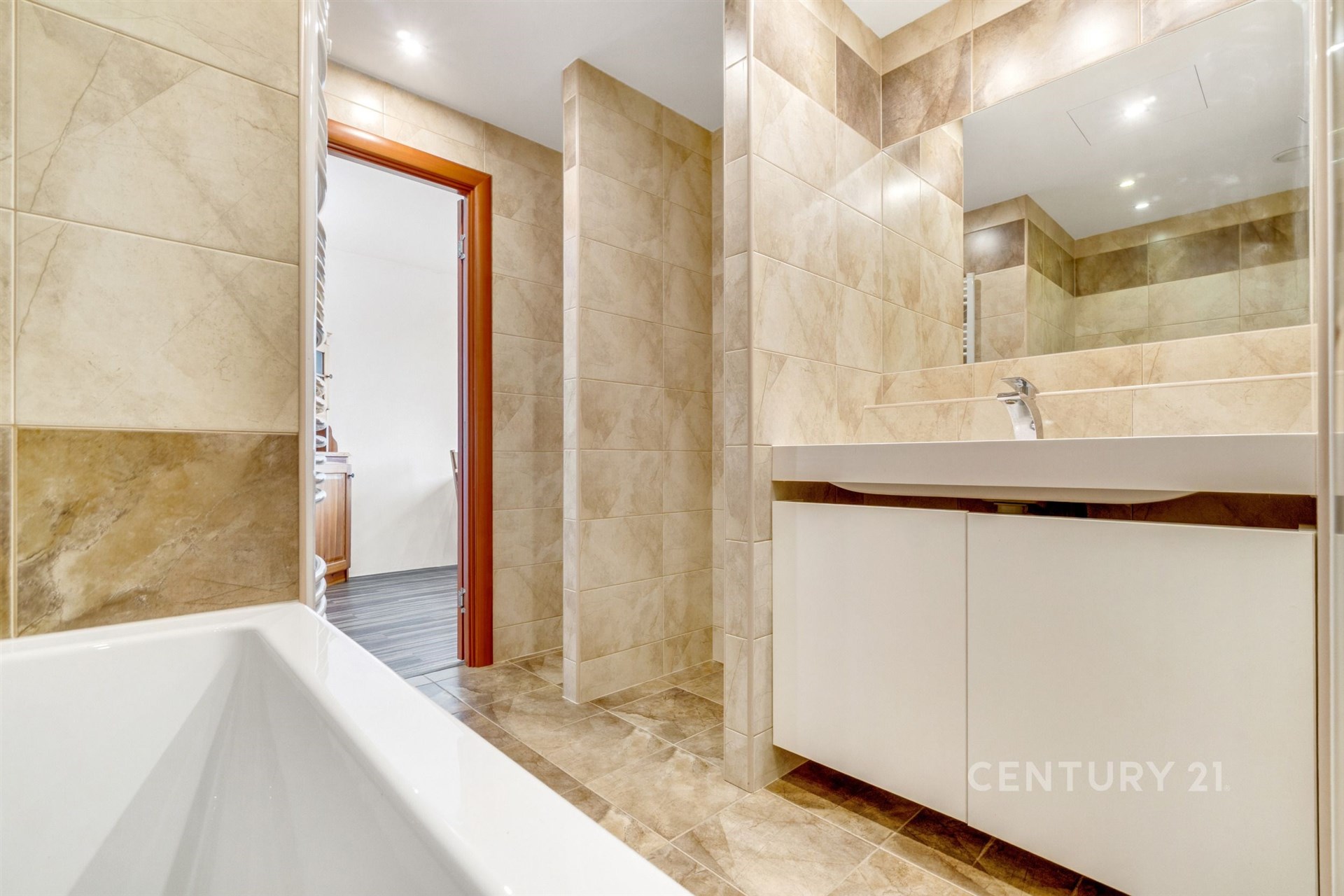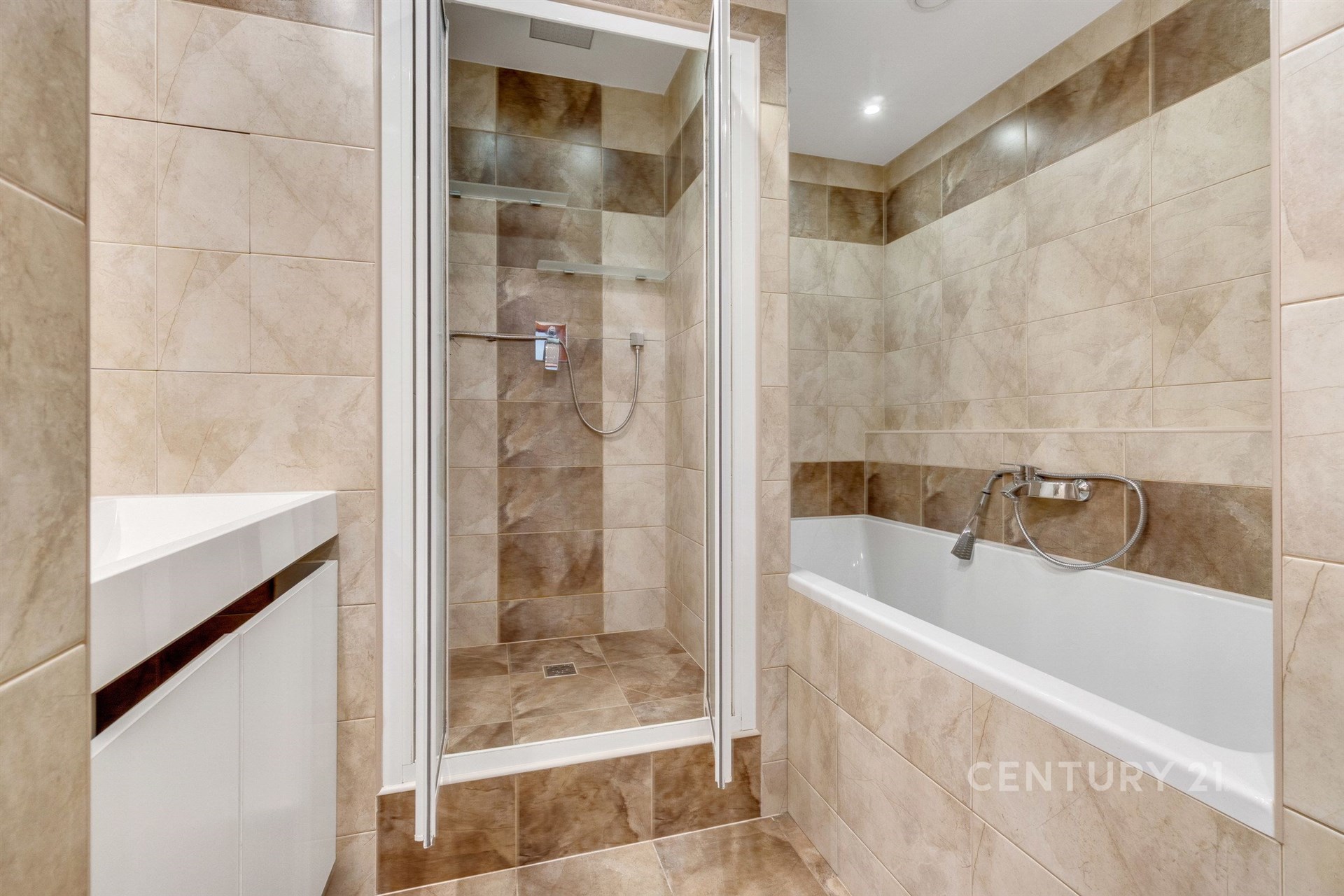 Zděná koupelna zahrnuje například XXL vanu ideální na dětské cachtání nebo relaxaci dospělých, sprchový box pro rychlé osvěžení a prostor pro umístění pračky a sušičky.