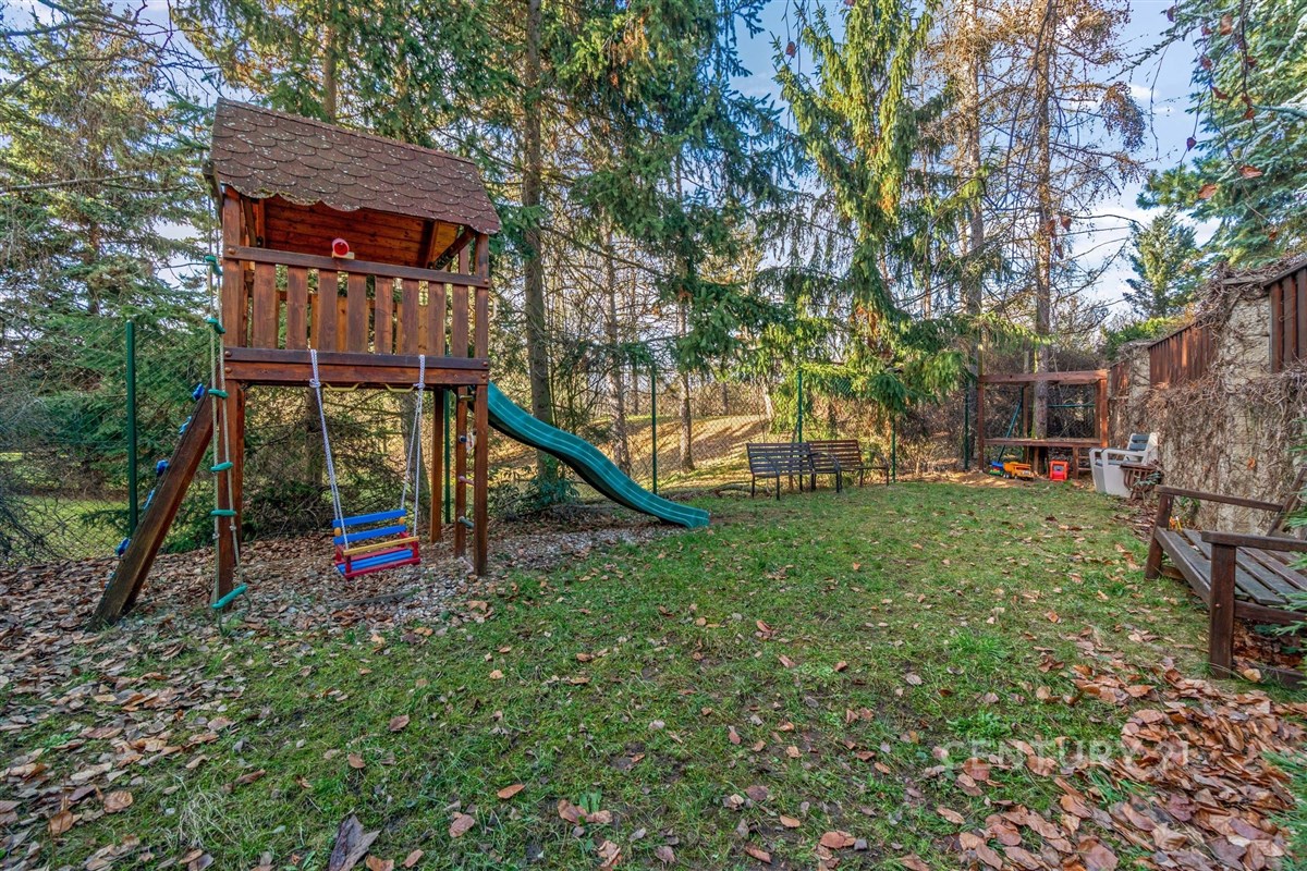 Rovnou za domem mohou jeho obyvatelé po domluvě využívat uzavřenou neveřejnou zahradu s dětským hřištěm.