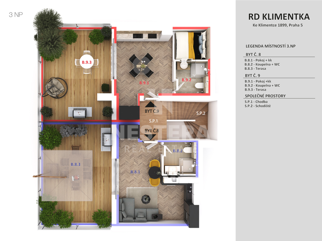 Interiér domu o celkové ploše 343 m² (bez terasy) nabízí čtyři podlaží se samostatnými bytovými jednotkami (2+1 v přízemí, dvě bytové jednotky 3+1 ve 2. a 3. NP) a půdní prostory s terasou (54 m²).