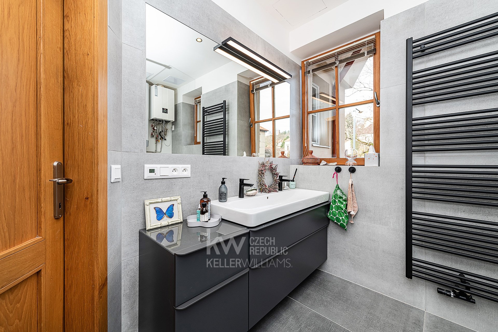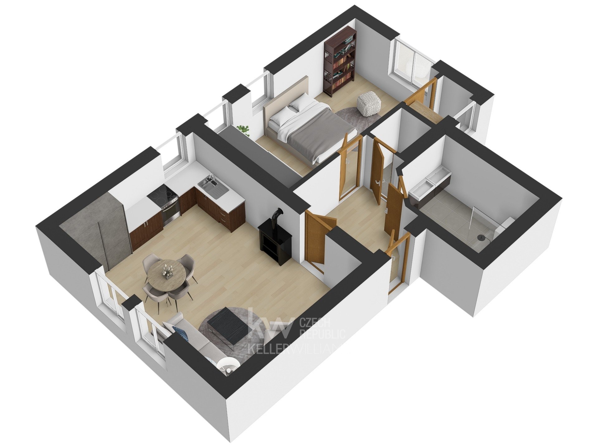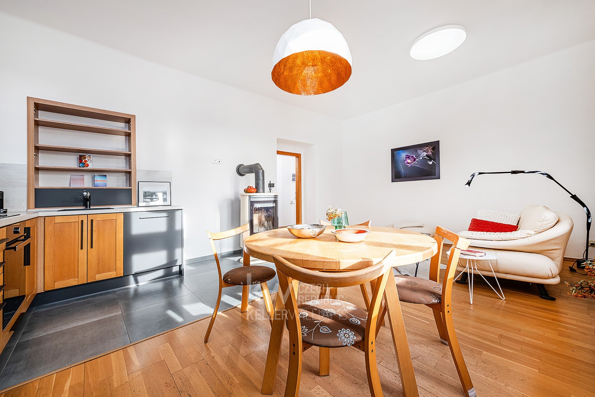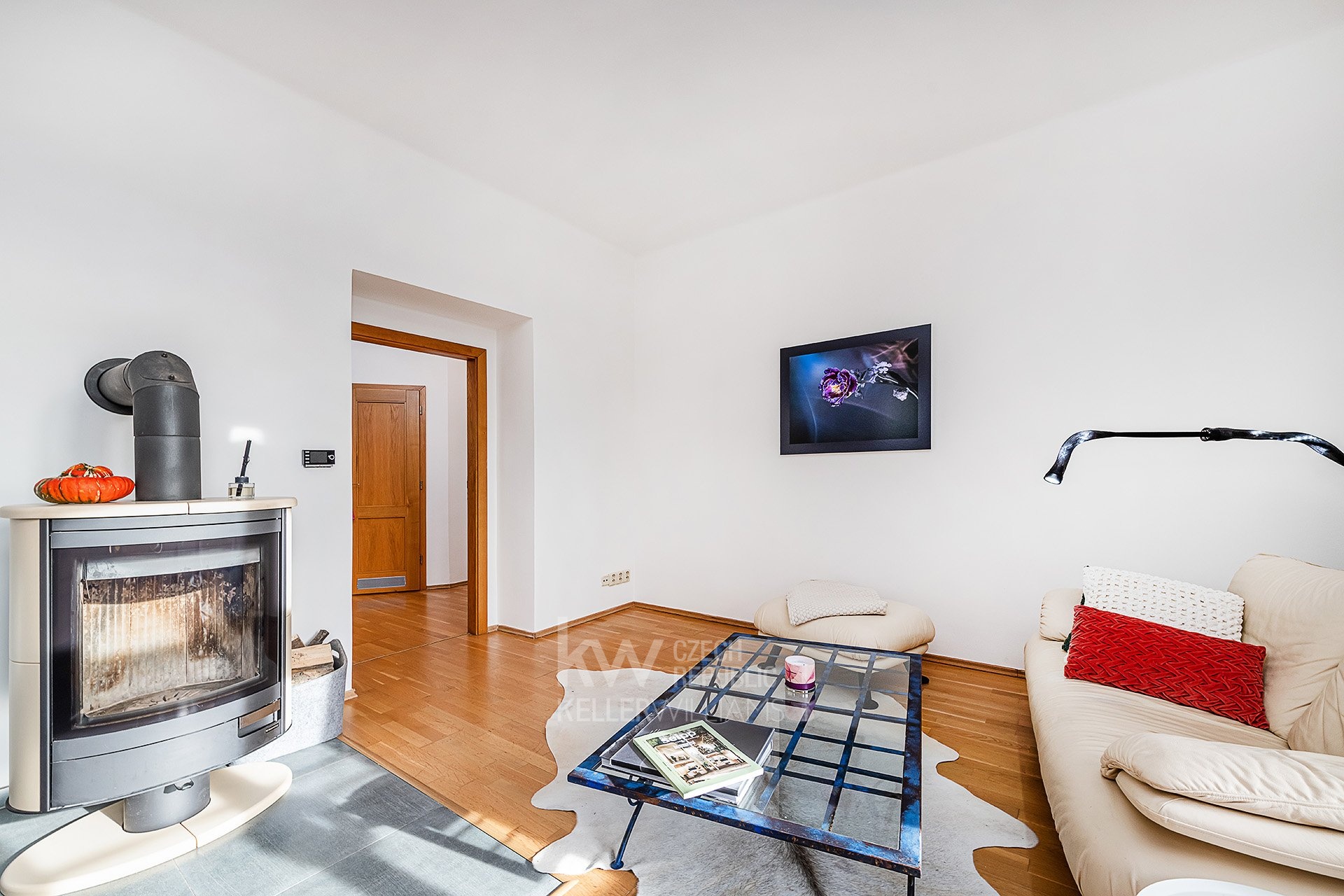 Centrem bytu je obývací pokoj s kuchyňským koutem, ze kterého je pohled do zeleně – na vzrostlé borovice a protější kopec směrem k Dívčím hradům. Nová kuchyňská linka je vybavena černým granitovým dřezem Franke, indukční deskou s posíleným přívodem, troubou a lednicí s mrazákem. Obytnou část doplňují otočná akumulační kamna, která nejen krásně vypadají, ale zároveň příjemně vytápějí prostor. Podlaha je kombinací dlažby a dřeva, osvětlení je kompletně nové.