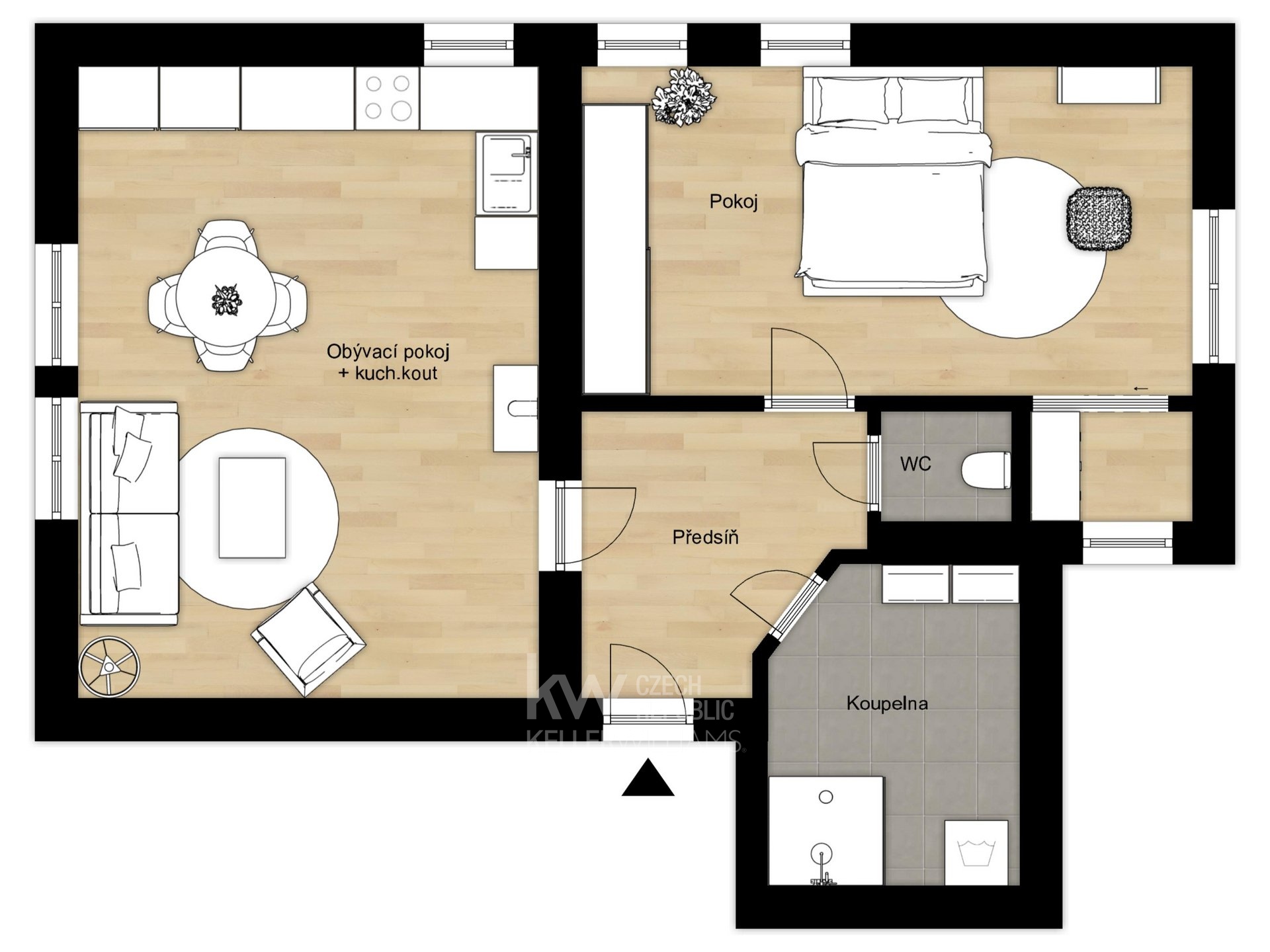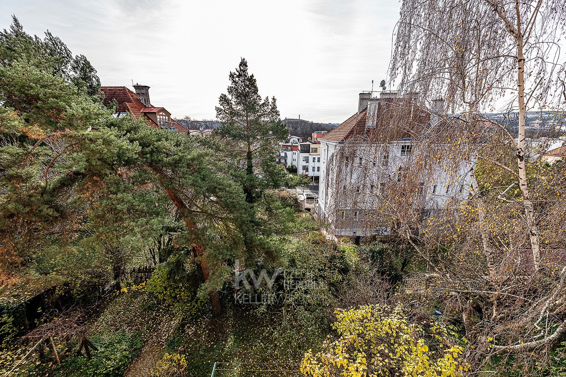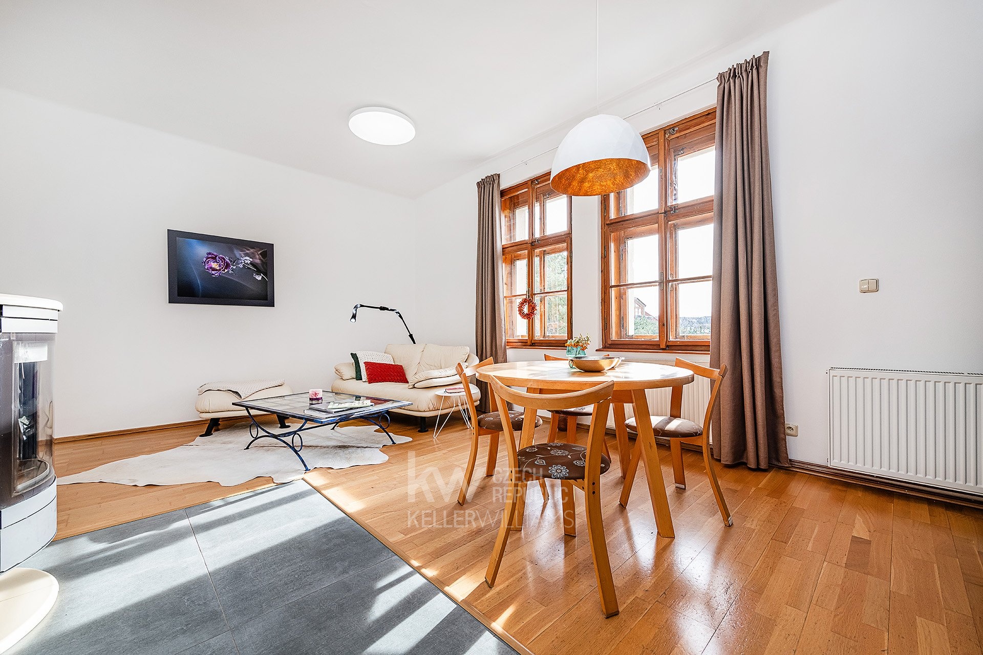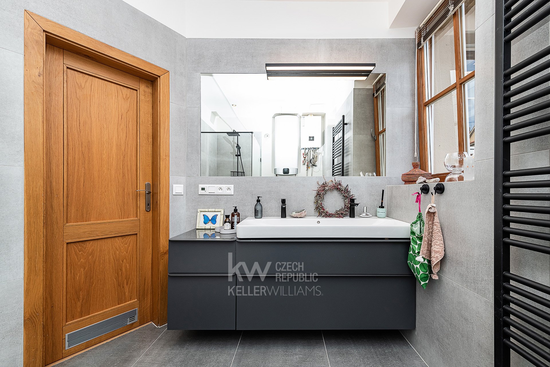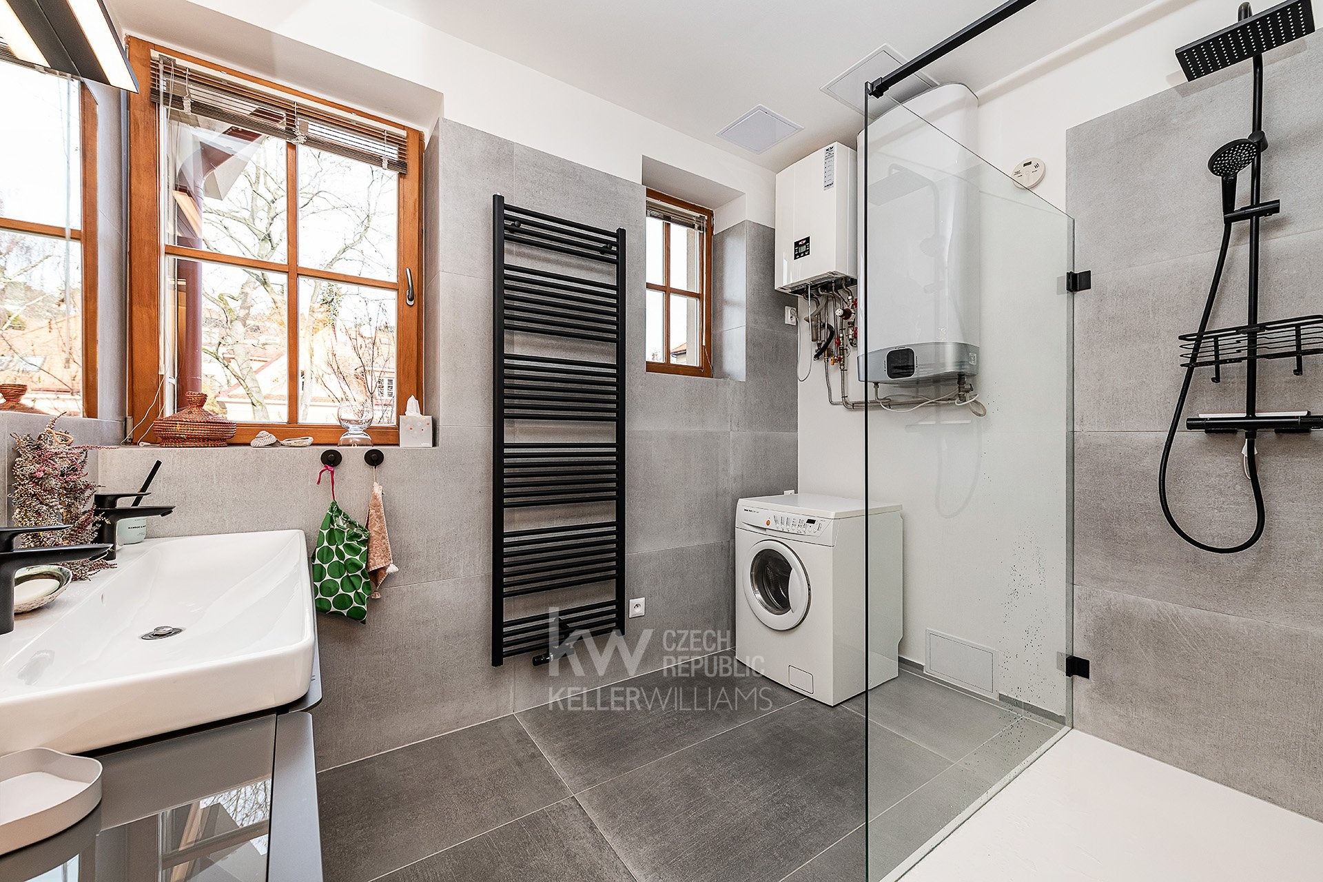 Centrem bytu je obývací pokoj s kuchyňským koutem, ze kterého je pohled do zeleně – na vzrostlé borovice a protější kopec směrem k Dívčím hradům. Nová kuchyňská linka je vybavena černým granitovým dřezem Franke, indukční deskou s posíleným přívodem, troubou a lednicí s mrazákem. Obytnou část doplňují otočná akumulační kamna, která nejen krásně vypadají, ale zároveň příjemně vytápějí prostor. Podlaha je kombinací dlažby a dřeva, osvětlení je kompletně nové.