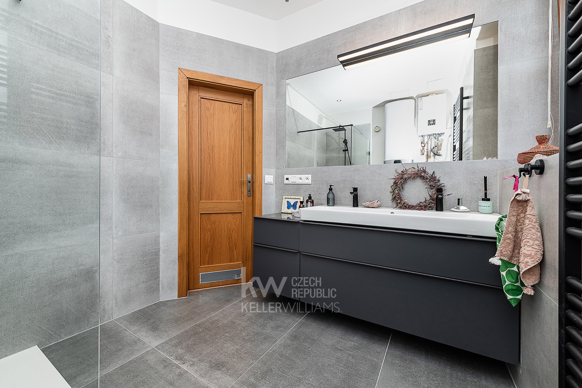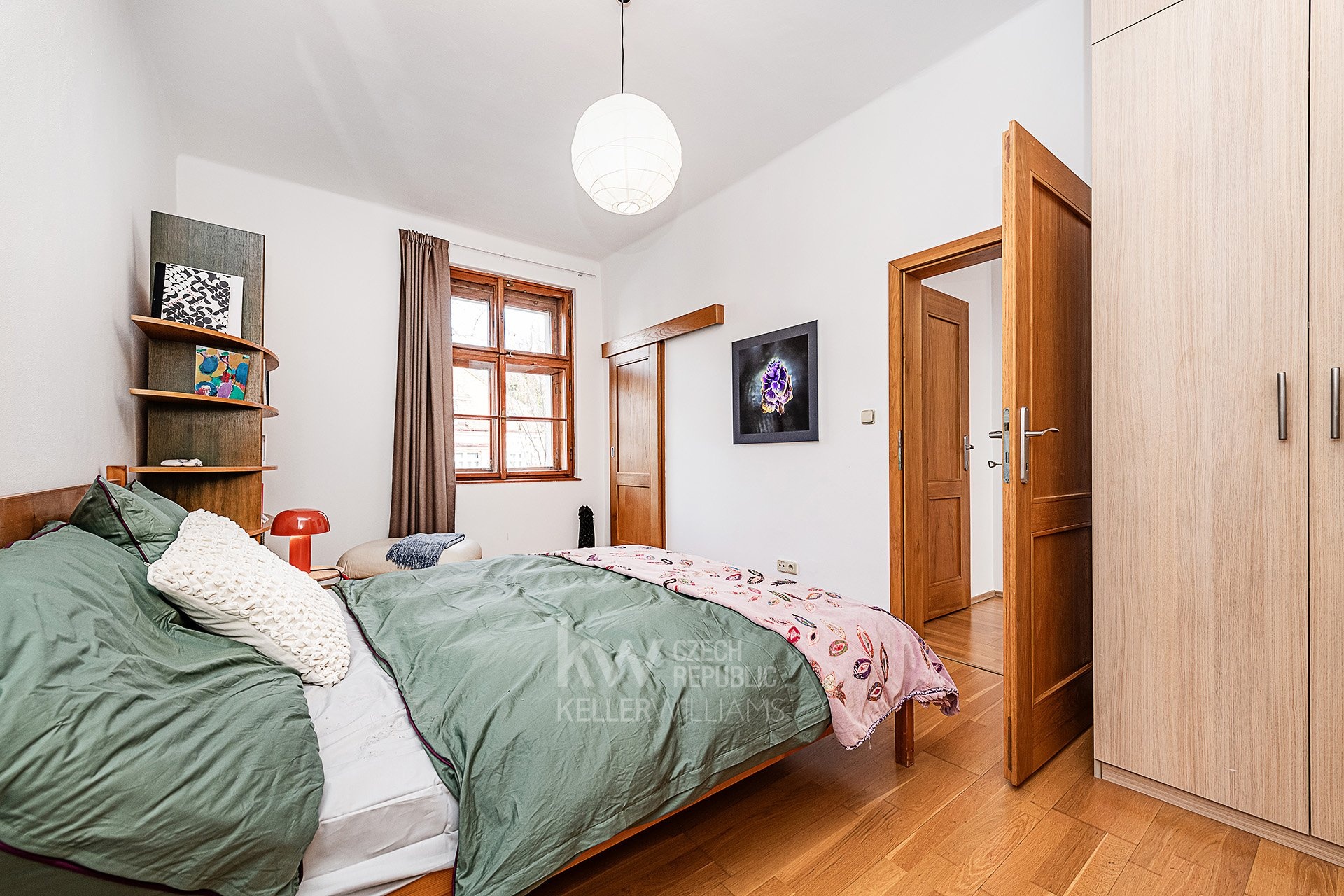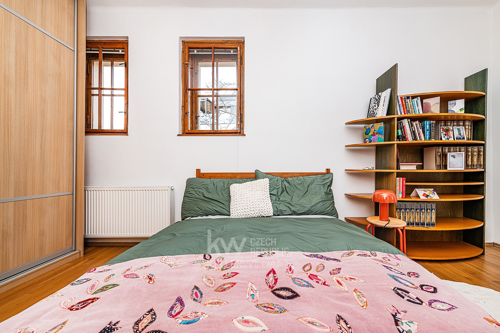 Ložnice je orientovaná do tiché ulice se stromy a odpoledním sluncem. Celou jednu stěnu zabírá vestavěná skříň Woodface, která poskytuje opravdu velkorysý úložný prostor. Koupelna je zcela nová, navržená v moderním stylu, s nadprůměrně velkým walk-in sprchovým koutem, dvojumyvadlem, místem na pračku a otopným žebříkem. Velkou předností je i technické řešení ohřevu vody a vytápění – díky kombinaci plynového kotle a elektrického bojleru Ariston si můžete zvolit nejvýhodnější zdroj podle aktuálních cen energií. Samostatná toaleta má praktický úložný prostor nad geberitem.