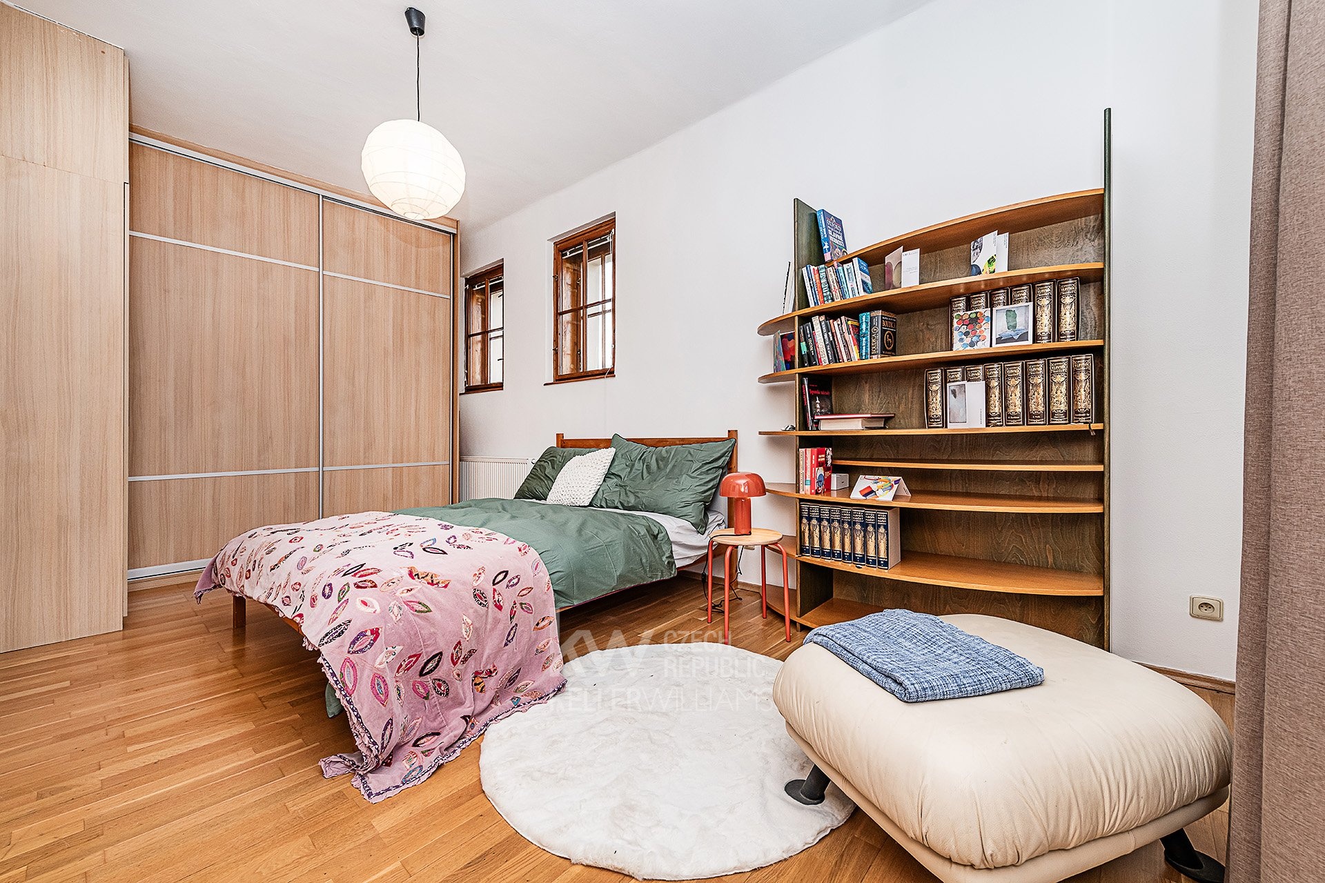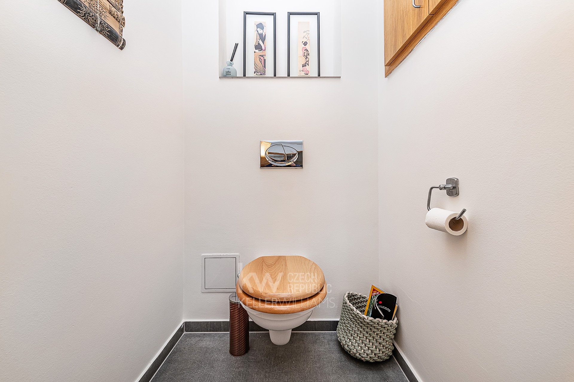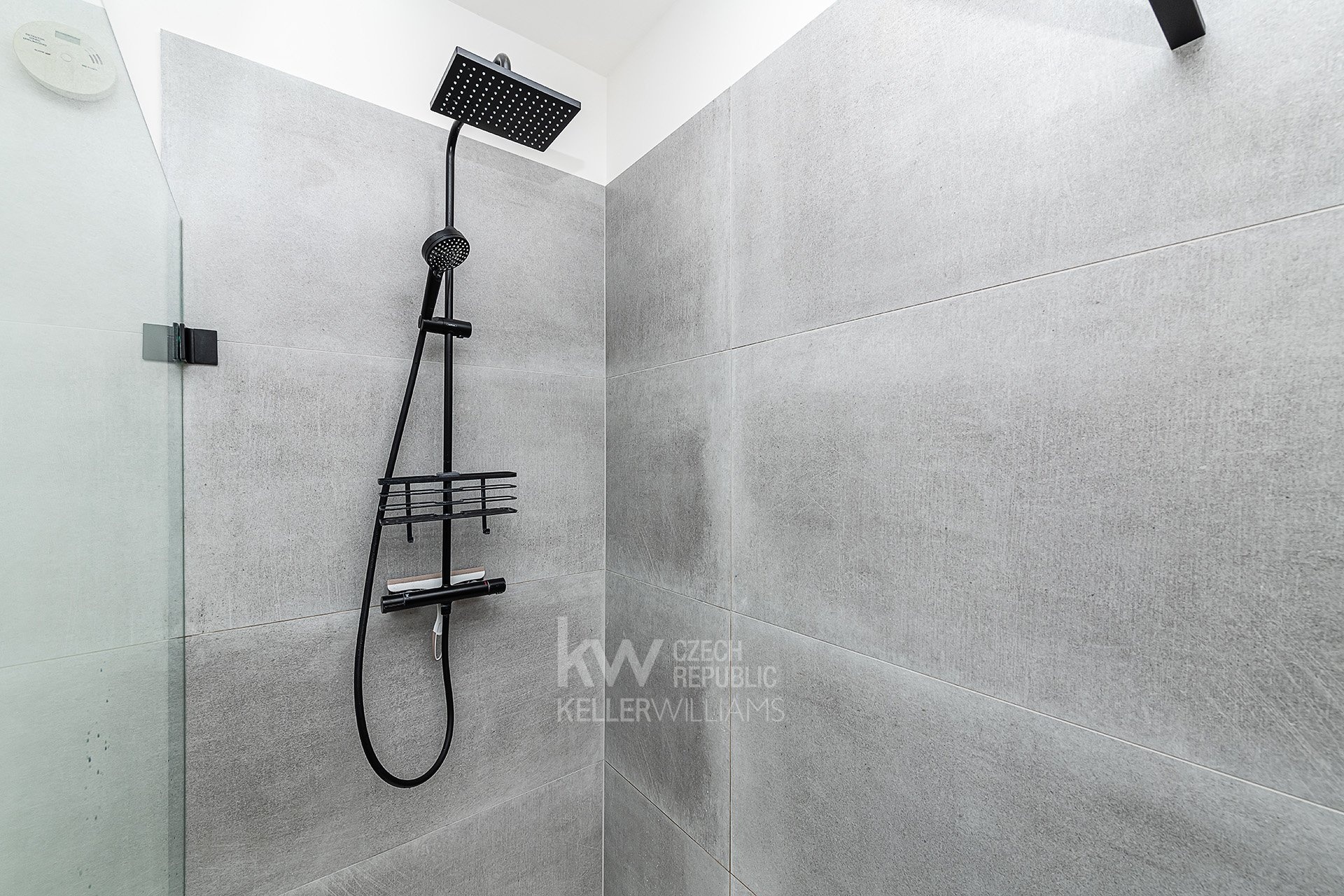 Ložnice je orientovaná do tiché ulice se stromy a odpoledním sluncem. Celou jednu stěnu zabírá vestavěná skříň Woodface, která poskytuje opravdu velkorysý úložný prostor. Koupelna je zcela nová, navržená v moderním stylu, s nadprůměrně velkým walk-in sprchovým koutem, dvojumyvadlem, místem na pračku a otopným žebříkem. Velkou předností je i technické řešení ohřevu vody a vytápění – díky kombinaci plynového kotle a elektrického bojleru Ariston si můžete zvolit nejvýhodnější zdroj podle aktuálních cen energií. Samostatná toaleta má praktický úložný prostor nad geberitem.