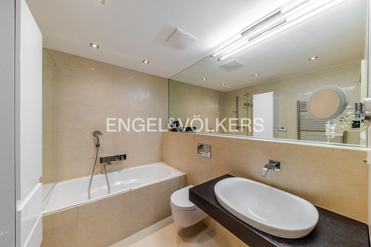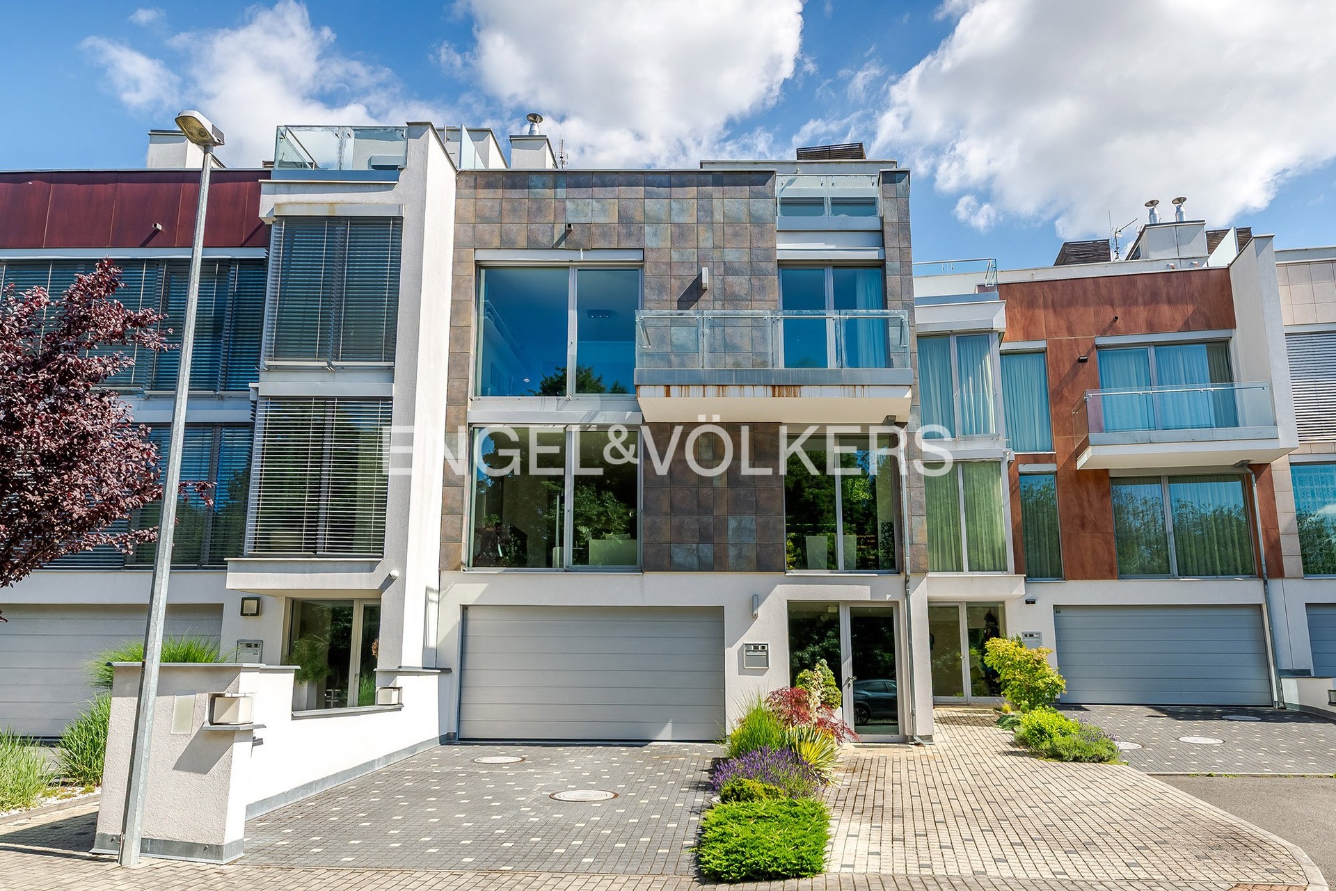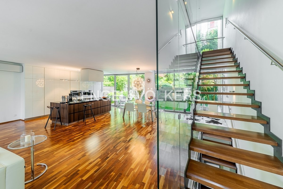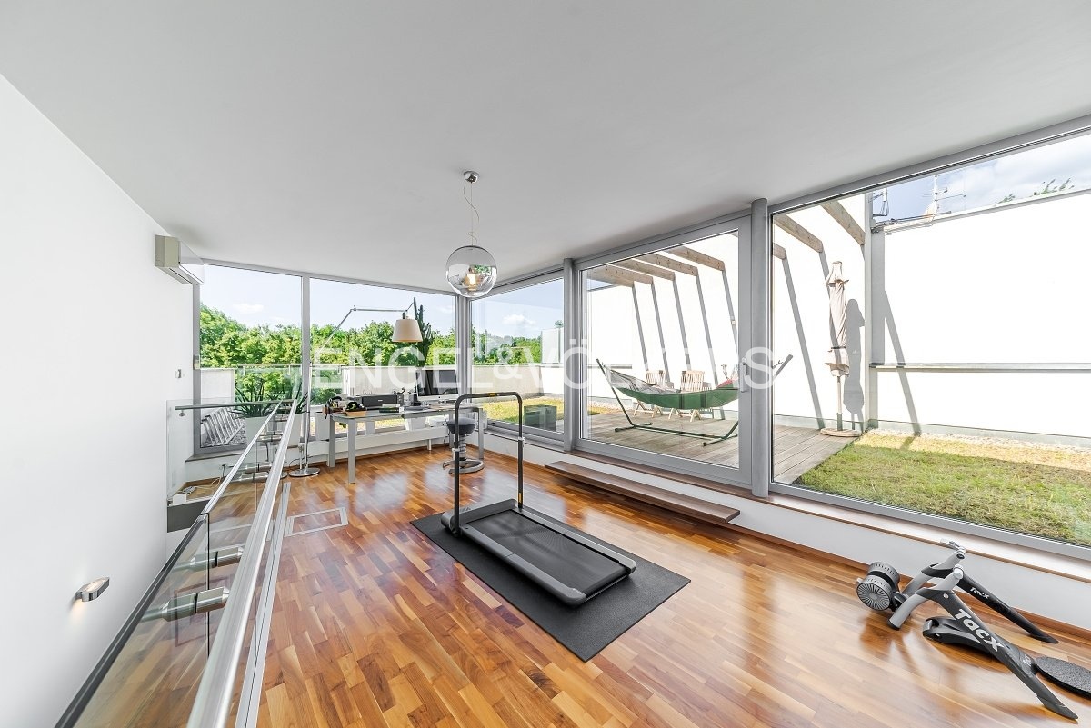 Dispozice domu je rozložena do čtyř podlaží propojených elegantním proskleným schodištěm. V nejnižším podlaží se nachází garáž pro dvě auta, vstupní hala, technické zázemí a koupelna. Hlavní obytné patro vyniká prostorným obývacím pokojem s designovou kuchyní Poliform Varenna Twelve se spotřebiči Miele a přímým vstupem na soukromou zahradu. Druhé patro nabízí hlavní ložnici s vlastní koupelnou a šatnou, dvě další neprůchozí ložnice, sdílenou koupelnu a balkon. V nejvyšším podlaží se nachází pracovna nebo další ložnice s přístupem na střešní terasu s přípravou na wellness zónu (koupelna, vířivka apod.).