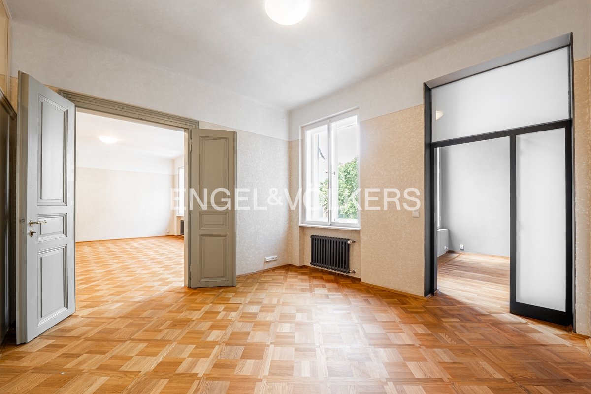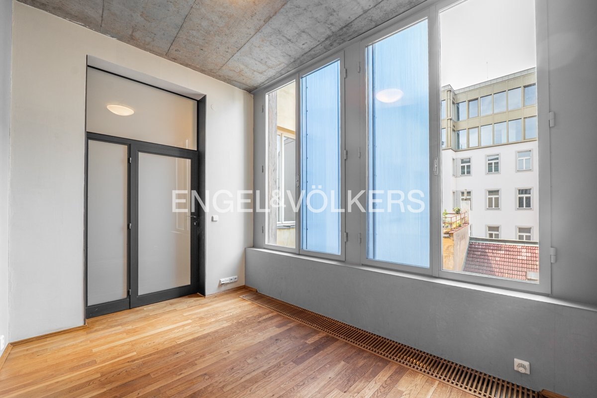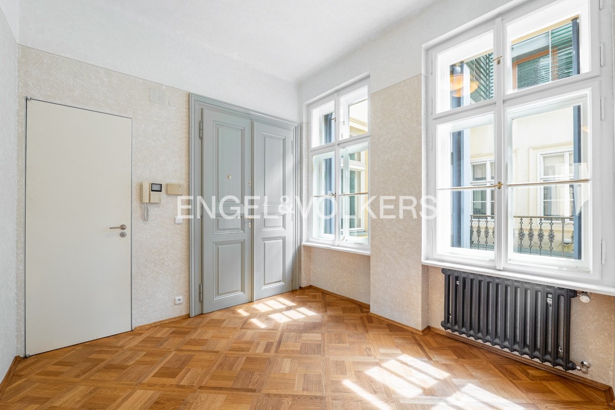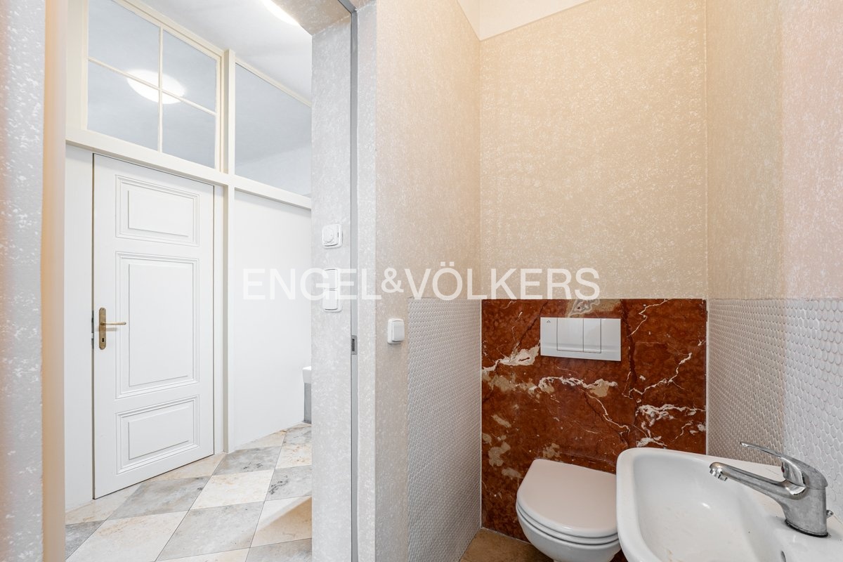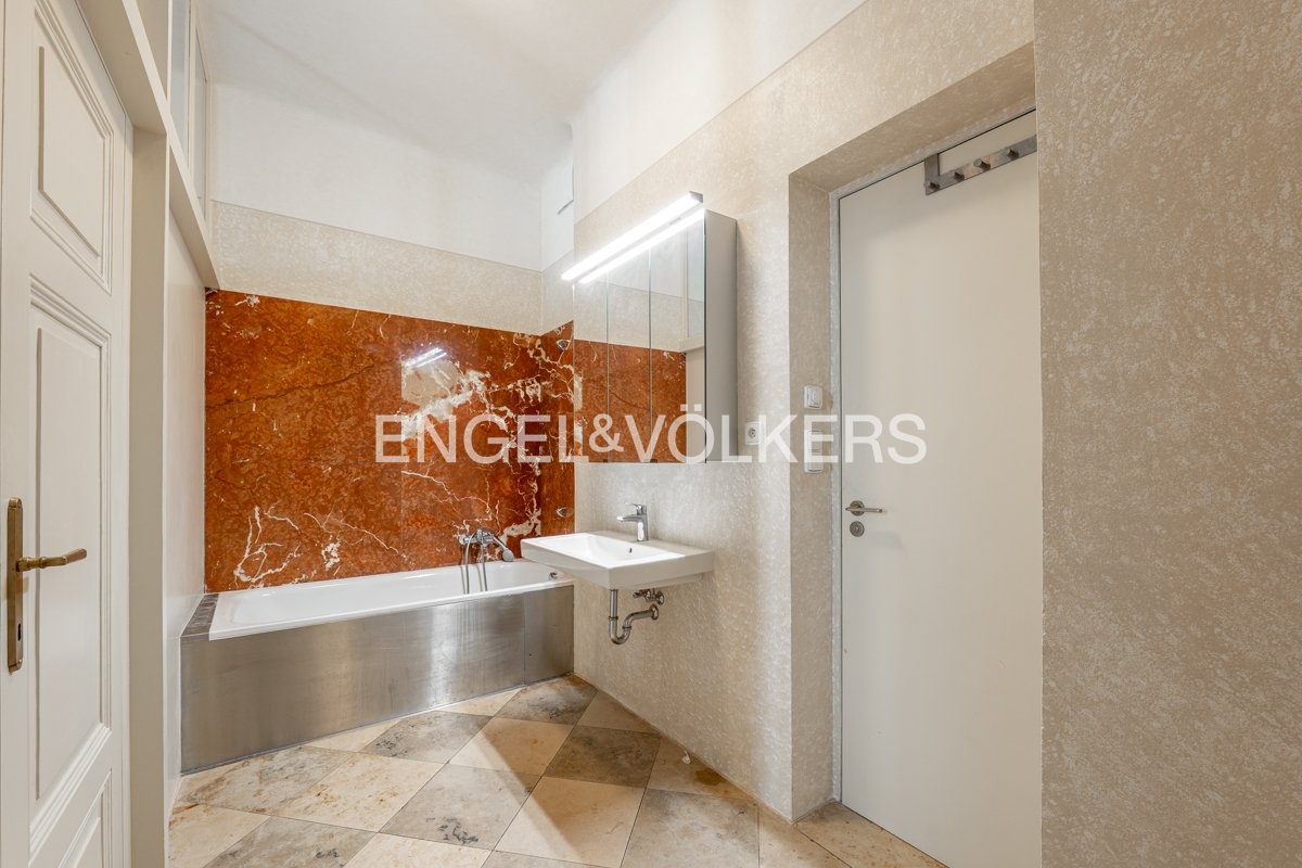 Byt s oblíbenou dispozicí 3+1 v historické částí domu nabízí vstupní halu, vzdušný obývací pokoj, samostatnou plně vybavenou kuchyň s výstupem na terasu, světlou ložnici a pracovnu. Koupelna je navrhnutá v kombinaci mramoru a benátského štuku, vybavená vanou a umyvadlem. Samostatná toaleta je přístupná z chodby. Bonusem je venkovní prostor v podobě dvou teras. Byt je dokonalou kombinací původních a moderních architektonických prvků. Profilovaný pohledový beton tvoří výborný kontrast s masivní dubovou podlahou. Do bytu, který se nachází ve čtvrtém NP Vás zaveze výtah, který se nachází u recepce, která objekt střeží 24/7.