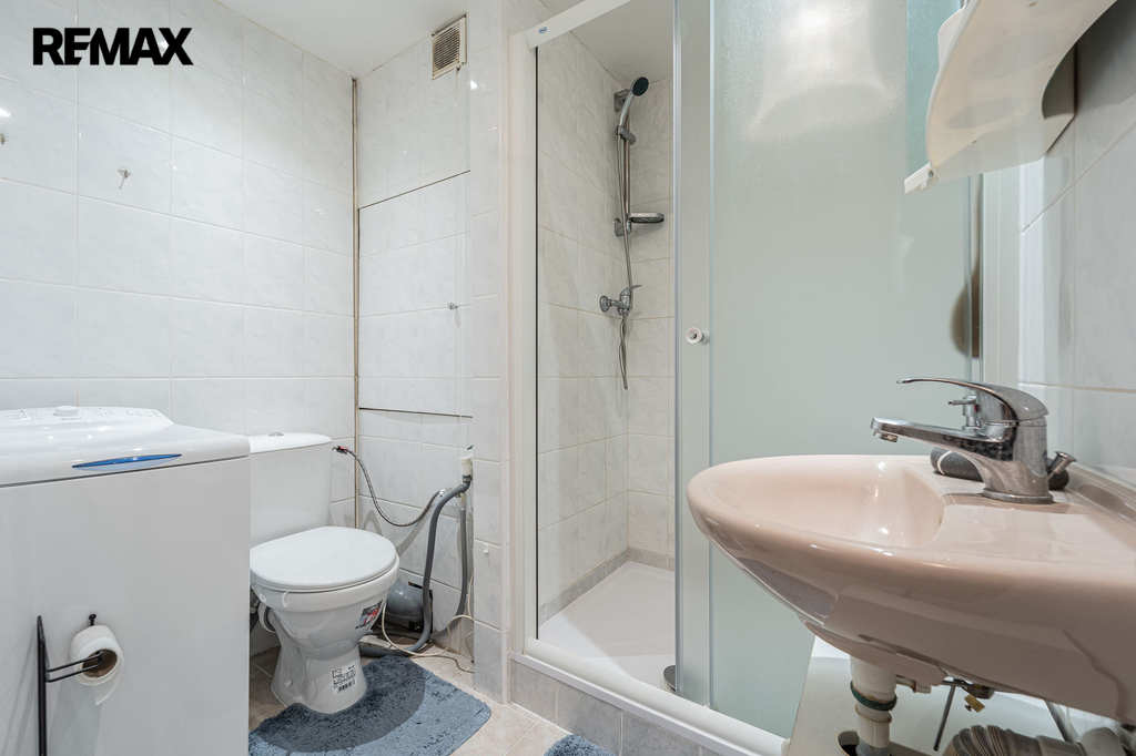 Koupelna s novým sprchovým koutem, koupelnovým nábytkem a pračkou.