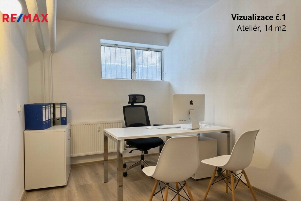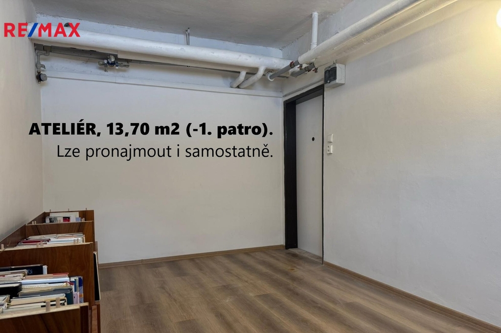 • Samostatný ateliér 13,7 m² se nachází v -1. NP. Přístup má výhradně pouze nájemce.