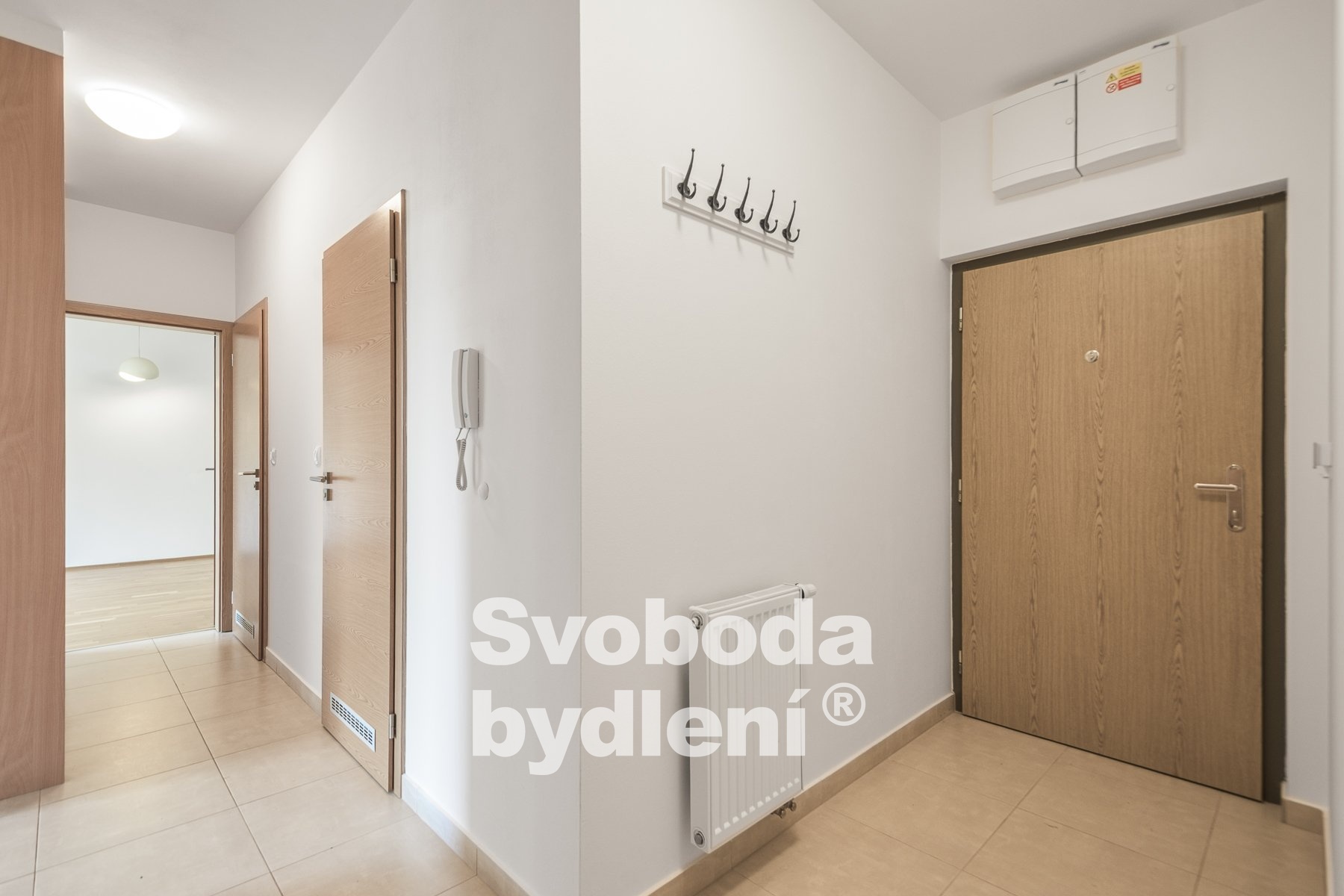 Vstupními dveřmi bytu vejdeme do předsíně tvaru L (cca 8,3m2) se vstupy do jednotlivých místností. Po levé straně nalezneme praktickou komoru (cca 3,25m2). Za rohem předsíně se napravo nachází koupelna (cca 3,99m2) a samostatná toaleta (cca 1,06m2). Vlevo je vstup do ložnice (cca 14,3m2) a v čele chodby pokračujeme do obývacího pokoje s kuchyňským koutem (cca 22,11m2). Pro přehlednou dispozici bytu doporučujeme shlédnutí podrobné virtuální prohlídky, všechny výměry jsou orientační.