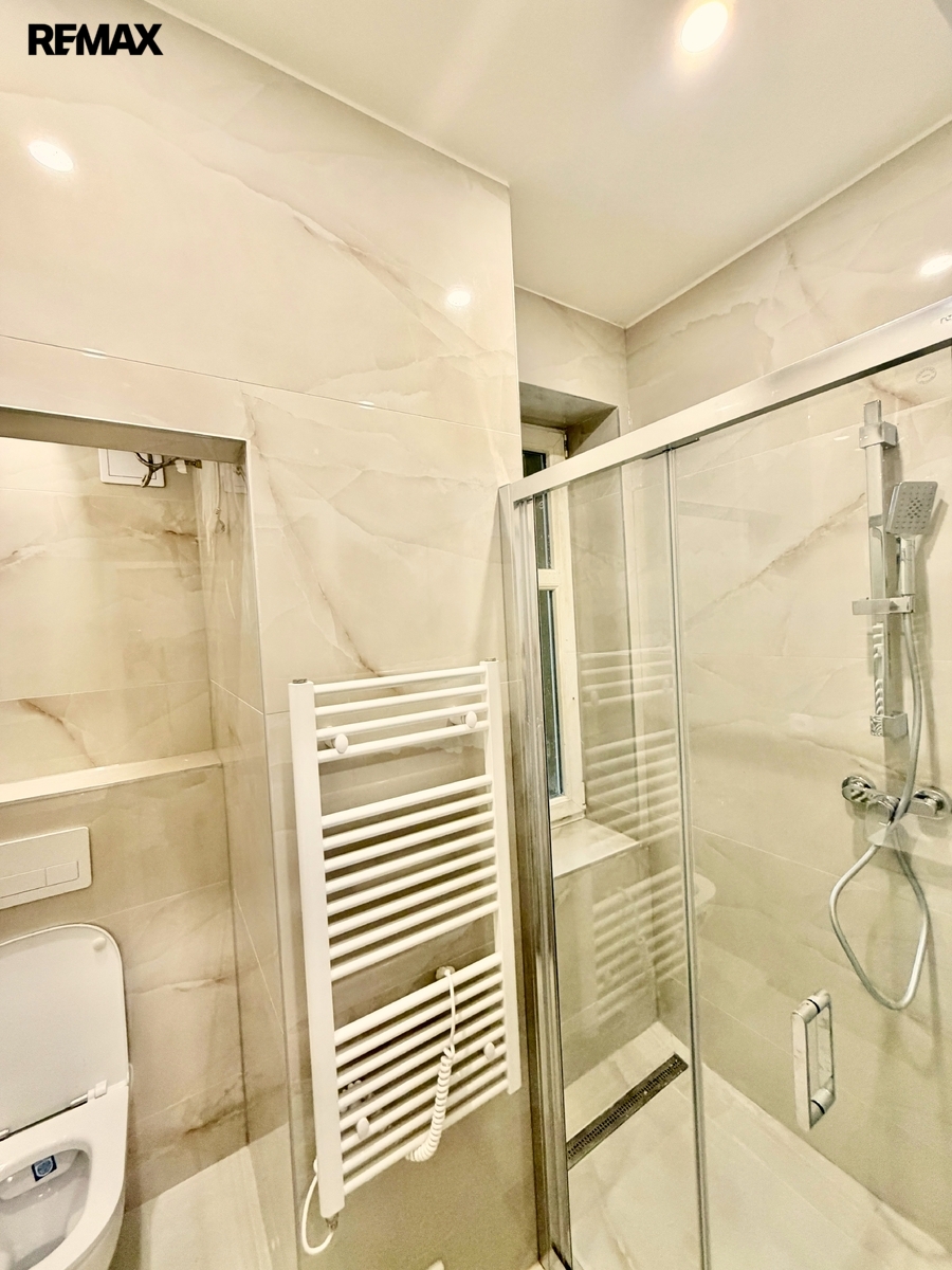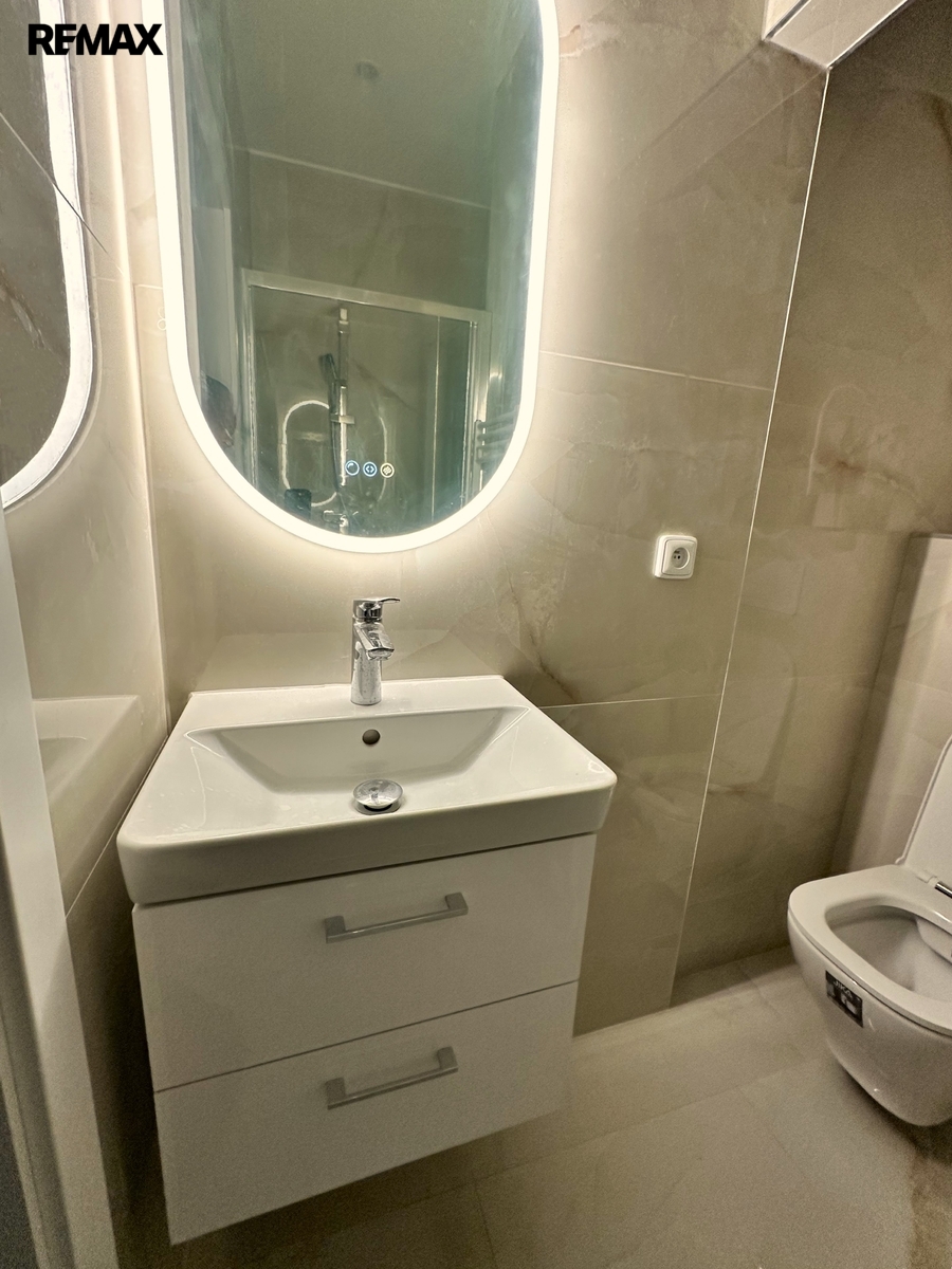 Koupelna se sprchovým koutem a oknem je vybavena závěsným WC, moderními obklady, umyvadlovou skříňkou a podsvíceným zrcadlem.