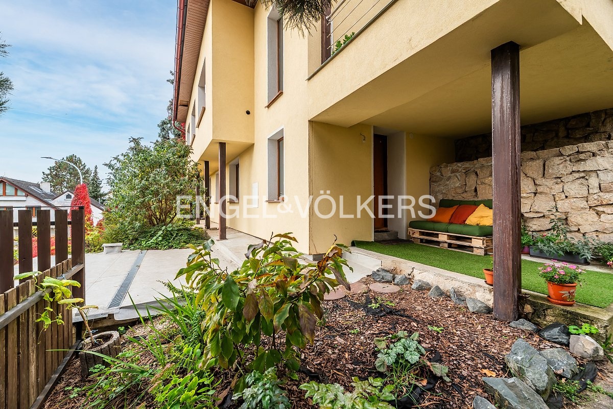K domu náleží dílna, půda a garáž, které nejsou započteny do celkové užitné plochy. Venkovní prostor tvoří pečlivě udržovaná zahrada o výměře 488 m² a čtyři terasy – dvě u vchodů do jednotlivých podlaží a další dvě na střechách garáže a dílny.