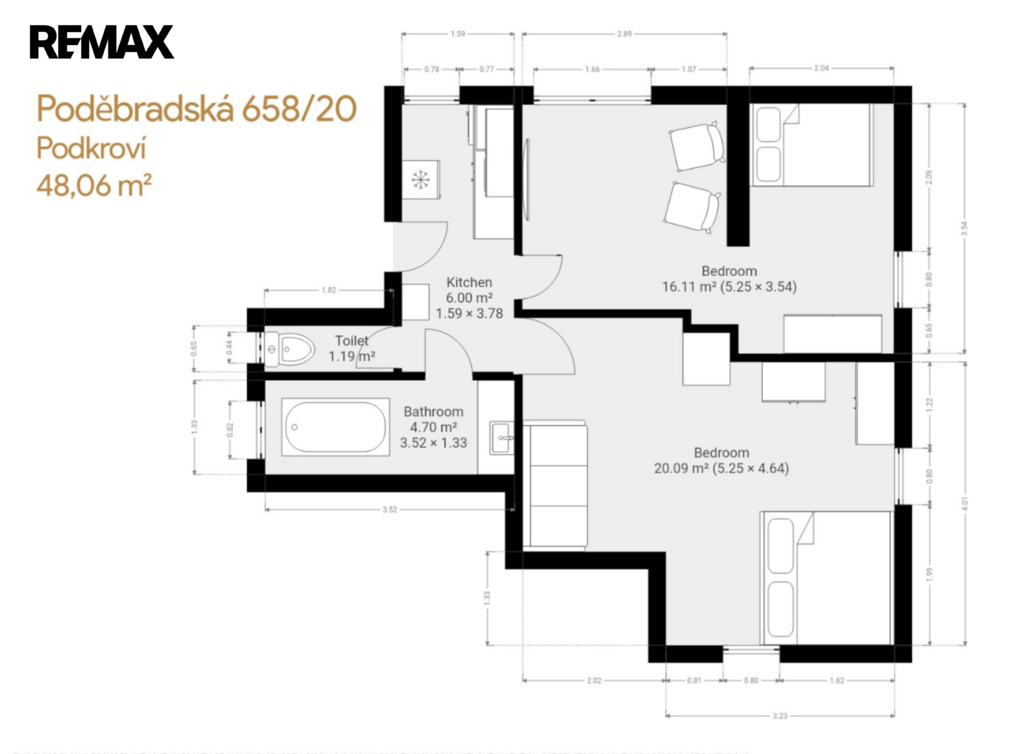 Dům je dispozičně řešen jako čtyři samostatné bytové jednotky. V suterénu se nachází byt o dispozici 2+kk, v prvním nadzemním podlaží byt 3+kk, ve druhém nadzemním podlaží rovněž byt 3+kk a v podkroví byt 2+kk. Součástí nemovitosti jsou dále dva nebytové prostory o velikosti 18 m² a 25 m², které rozšiřují možnosti využití a zvyšují celkový výnosový potenciál.