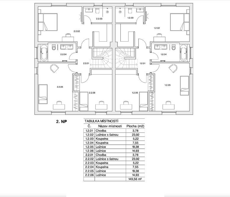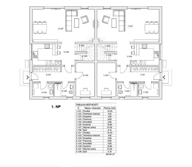 • Celková podlahová plocha domu 314 m² rozložená ve dvou jednotkách se dvěma nadzemními podlažími.