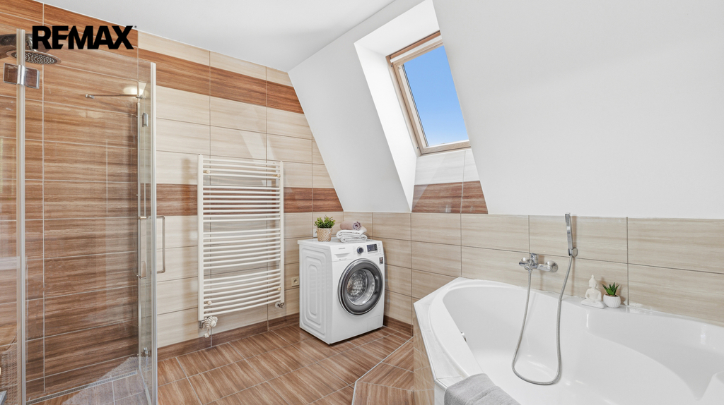 Horní bytová jednotka disponuje moderní kuchyňskou linkou s vestavěnými spotřebiči, včetně myčky nádobí a indukční varné desky. Koupelna je vybavena jak vanou, tak sprchovým koutem, což zajišťuje maximální komfort. Z obytné části je navíc vstup na prostorný balkon.