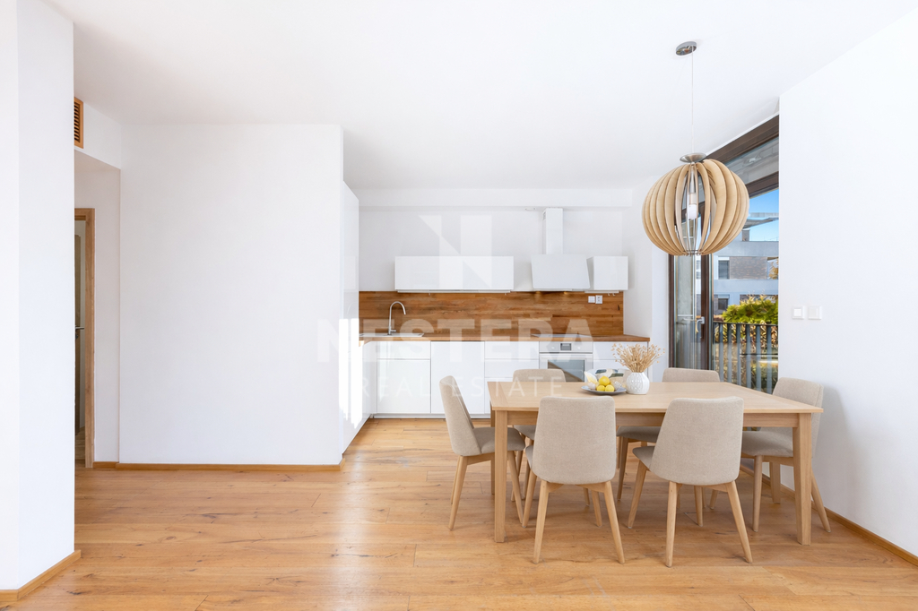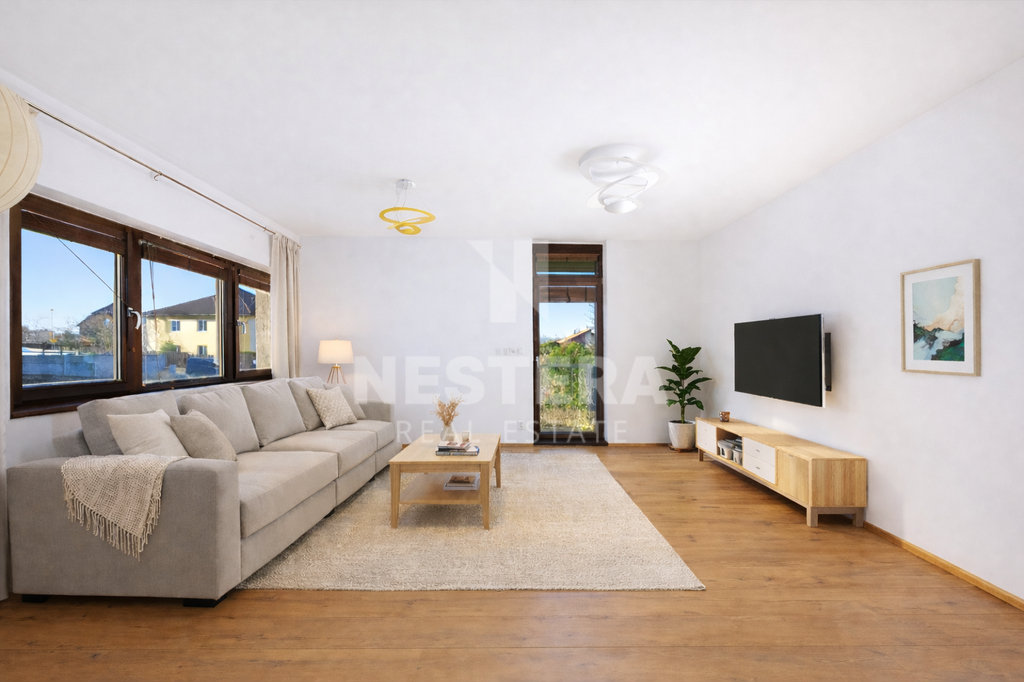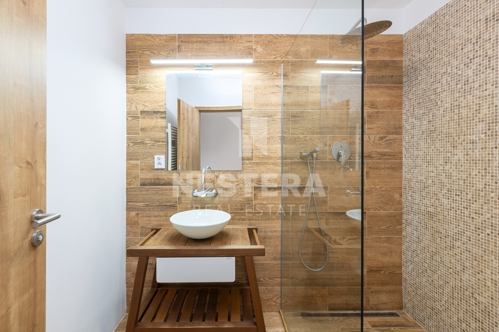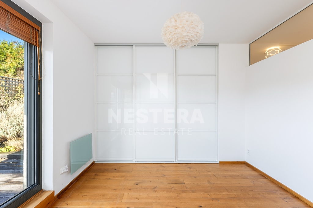 Interiér bytu je rozvržen tak, aby podpořil světlo, prostor a přirozený tok mezi jednotlivými částmi. V horním podlaží se nachází reprezentativní obývací prostor s přímým vstupem na zahradu, doplněný elegantně integrovanou kuchyní. Ložnice s kvalitním úložným systémem, prostorná koupelna se sprchovým koutem, samostatná toaleta, technická místnost a vstupní hala se schodištěm doplňují funkční charakter této úrovně.