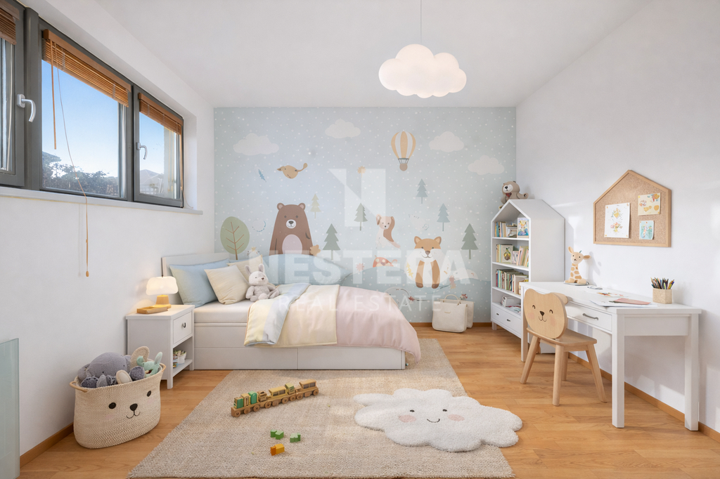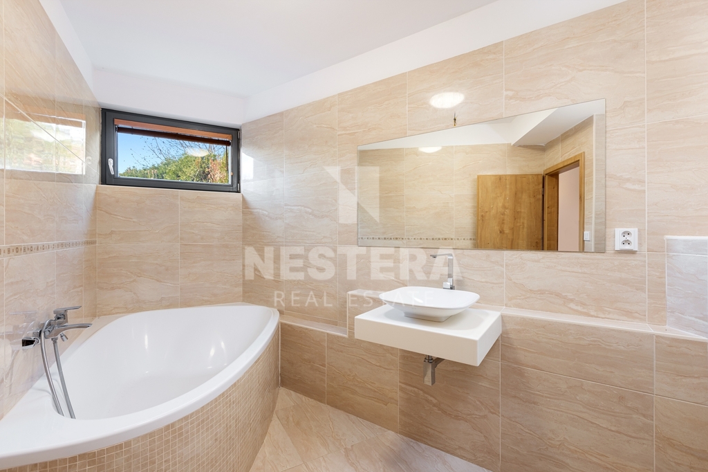 Spodní podlaží poskytuje dvě samostatné místnosti, které lze využít jako dětské pokoje, soukromou pracovnu, fitness či komfortní zázemí pro hosty. Druhá koupelna s rohovou vanou, toaletou a oknem zajišťuje plnohodnotné využití této části bytu a podtrhuje flexibilitu celkové dispozice.