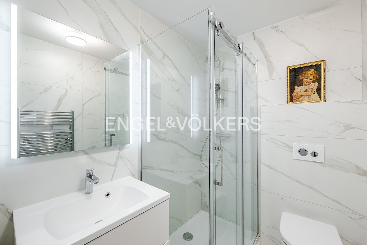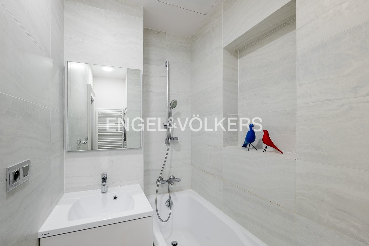Jedna koupelna je vybavena sprchovým koutem, druhá vanou. Byt je vybaven kvalitními spotřebiči značky Bosch, vestavnými skříněmi Komandor, pračkou a sušičkou. Interiér si zachoval typické vinohradské prvky, jako jsou vysoké stropy a špaletová okna, a doplňují ho kvalitní dřevěné podlahy, které podtrhují elegantní charakter bytu. Obyvatelé domu mohou zároveň využívat společný vnitroblok se zahradou a posezením.