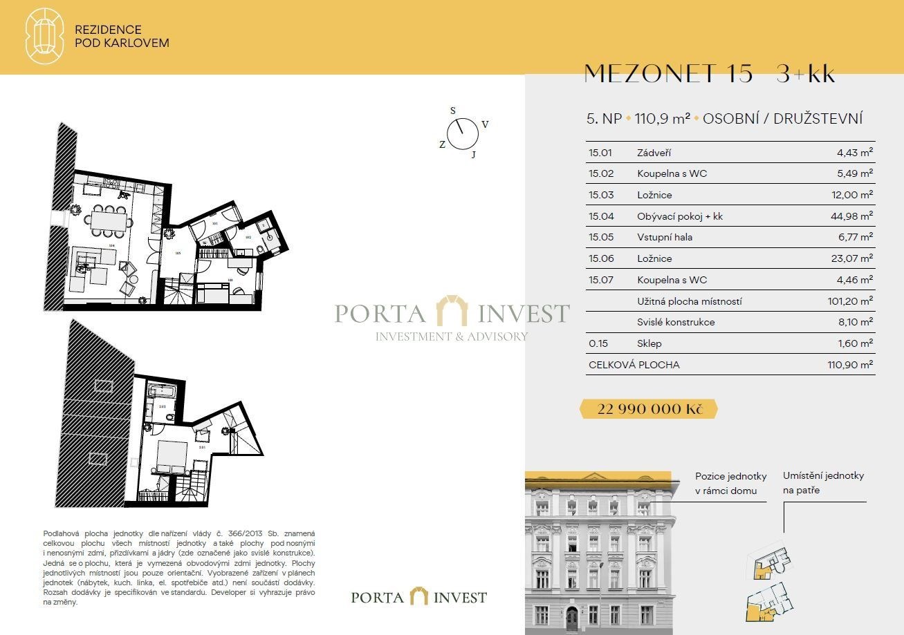 Toužíte po výjimečném domově, který překračuje hranice běžného bydlení? Objevte dechberoucí mezonetový byt 3+kk o velkorysé rozloze 109,3 m² v prestižní Rezidenci Pod Karlovem.