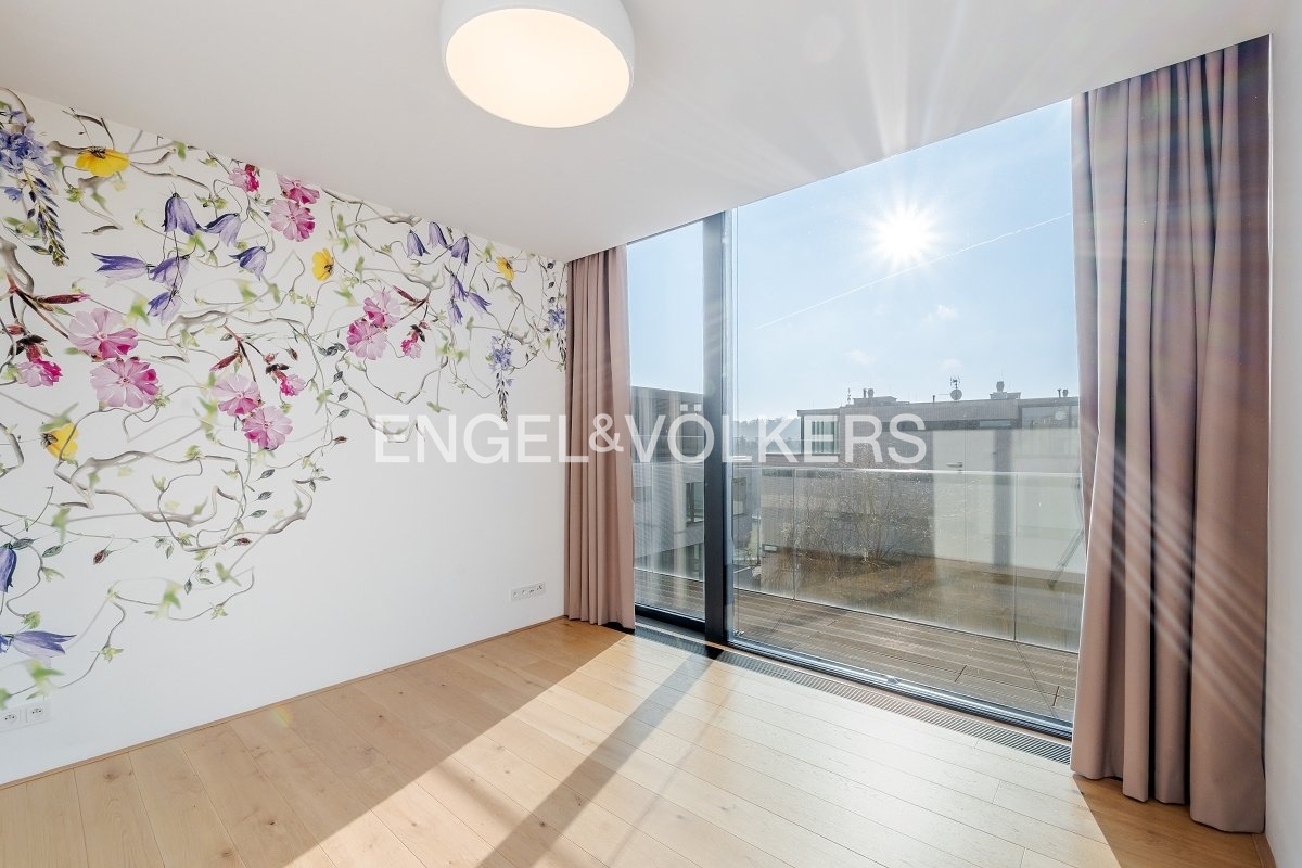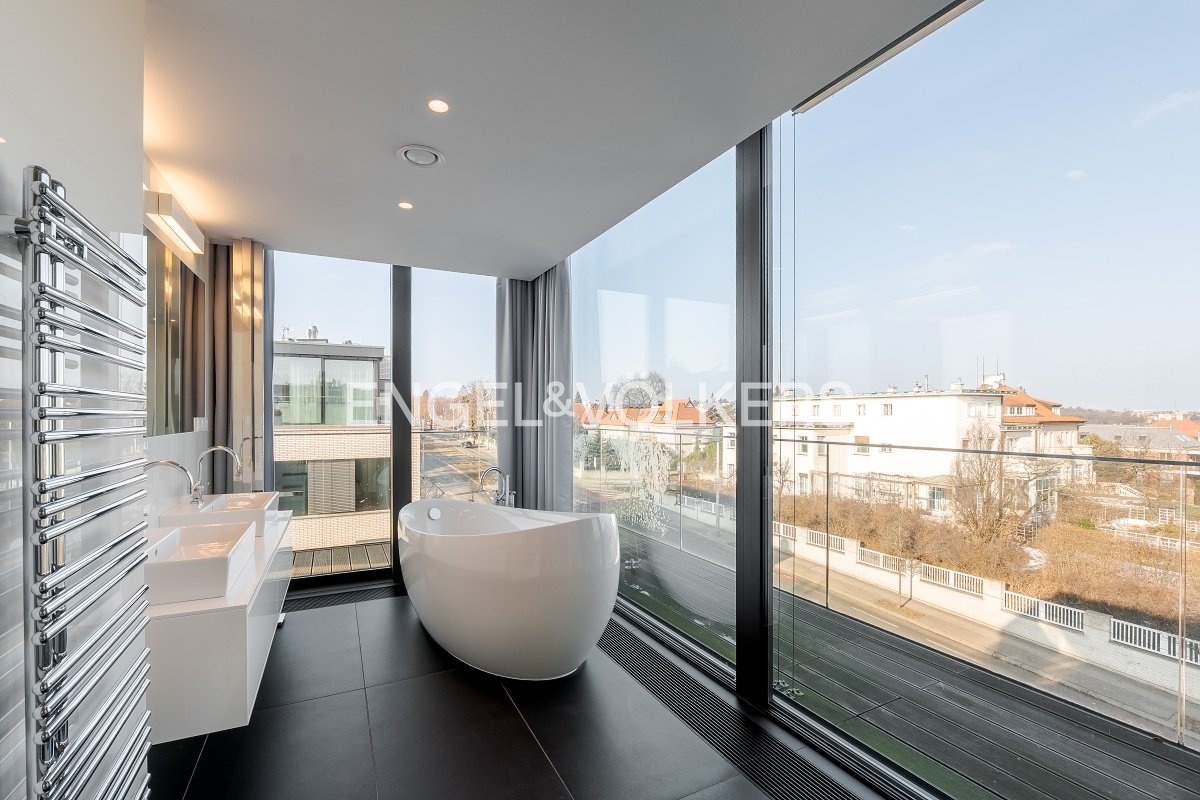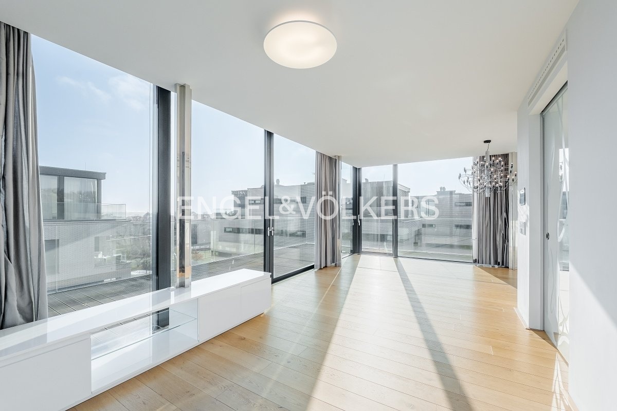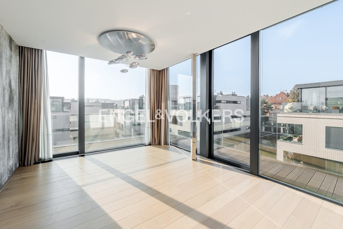 K pronájmu je nabízen výjimečný nezařízený penthouse s terasou vedenou po celém obvodu bytu a s působivými panoramatickými výhledy na Pražský hrad. Rezidence se nachází v prestižním projektu Royal Triangle, navrženém renomovaným architektonickým studiem Schindler Seko, který klade důraz na nadčasovou architekturu, soukromí a vysoký standard bydlení. Byt je situován ve 4. patře moderní budovy v uzavřeném a střeženém areálu s recepcí, upravenou společnou zahradou a podzemním parkováním. Atraktivní lokalita na pomezí vyhledávaných čtvrtí Střešovice a Ořechovka nabízí klidné rezidenční prostředí s výbornou dostupností do centra města, na letiště i k mezinárodním školám. Stanice metra Hradčanská a Dejvická jsou v docházkové vzdálenosti.