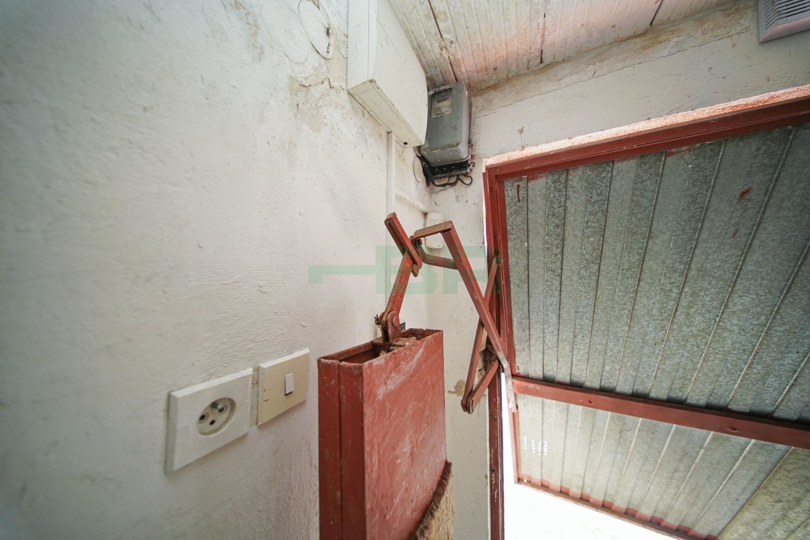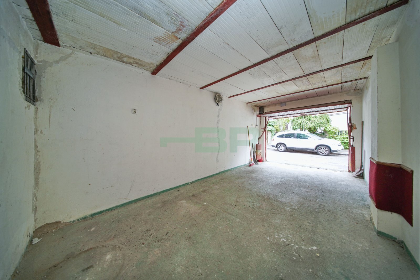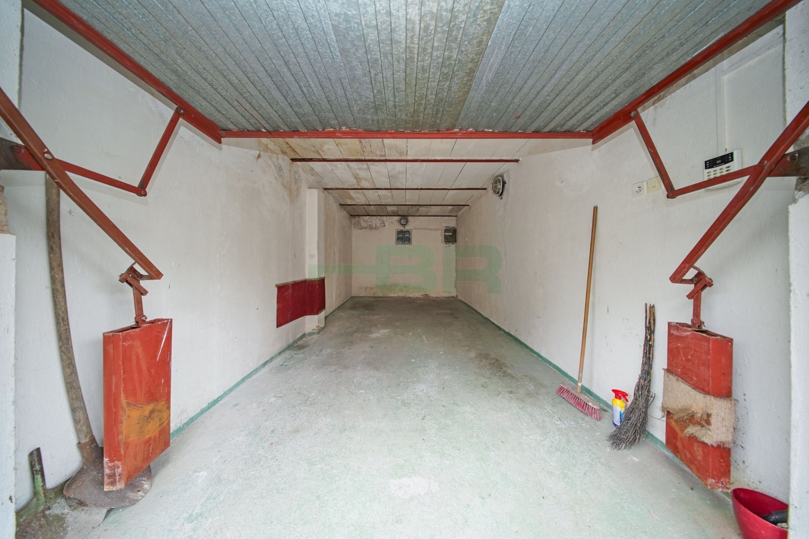 Výška stropu 229 cm. Plechová zvedací vrata s vjezdovými rozměry (výška 187 cm x šířka 230 cm).