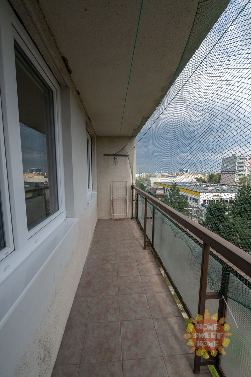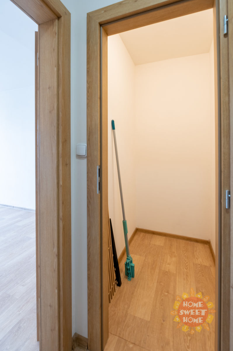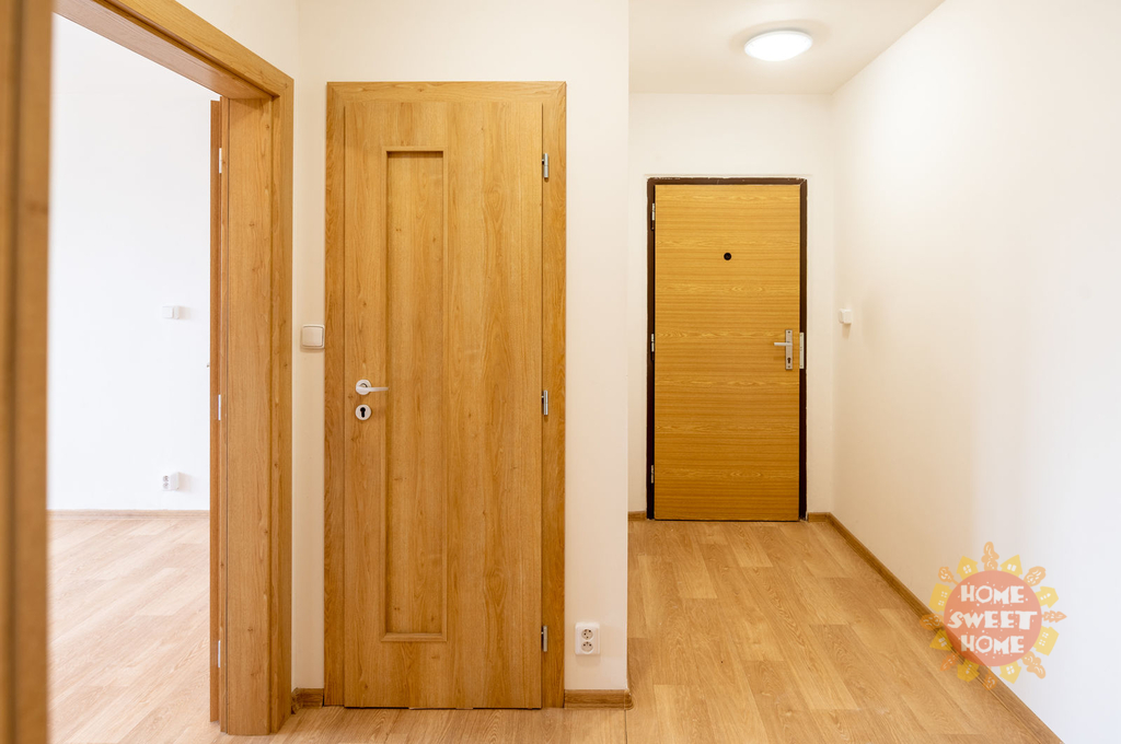 Byt sestává z obývacího pokoje s kuchyňským koutem vybaveným lednicí, sporákem a troubou, dále z ložnice, koupelny se sprchovým koutem a toaletou, komory a vstupní haly. Z obývacího pokoje je vstup na prostornou lodžii (7 m2).