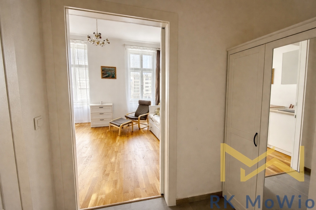 Nabízíme k prodeji světlý byt o dispozici 1+kk s podlahovou plochou 26,2 m², situovaný v 1. patře (2. nadzemní podlaží) kompletně zrekonstruované budovy s výtahem. Dispozice je řešena prakticky a účelně – vstupní chodba přirozeně odděluje obytnou část od koupelny a současně nabízí prostor pro vestavěné skříně. Hlavní obytná místnost vyniká vysokými stropy a špaletovými okny, která dodávají interiéru vzdušnost a dostatek denního světla. Prostor umožňuje variabilní uspořádání na část obývací, jídelní i klidovou. Koupelna je přístupná samostatně z chodby a disponuje sprchovým koutem, umyvadlem a toaletou.