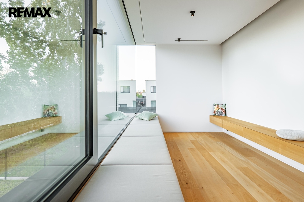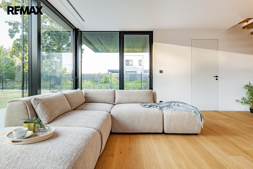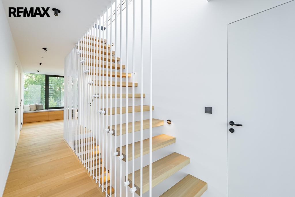 Dům je krásně prosvětlen a je vybaven hliníkovými okny s izolačními trojskly se zabudovanými elektrickými žaluziemi. Dřevěné dvouvrstvé podlahy se kombinují s keramickou dlažbou v koupelnách.