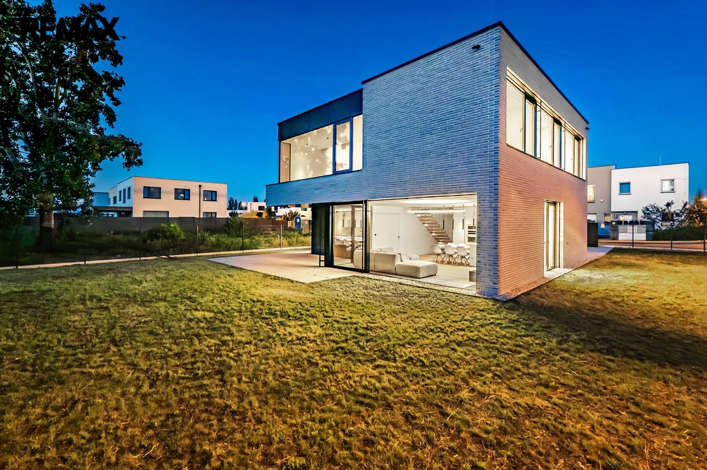 K domu náleží zahrada, jejíž součástí je místnost na uskladnění zahradního nábytku a už zde máte připraveno technické zázemí pro vybudování bazénu. Vjezd na pozemek je prostřednictvím posuvné brány s elektrickým pohonem a k dispozici tady máte 3 venkovní parkovací stání. Součástí vstupu je praktický balíkový box integrovaný přímo do oplocení. V exteriéru se také můžete těšit na zelenou střechu, která poskytuje prostor pro příjemný relax. Ve večerních hodinách dodává budově jedinečný vzhled efektní venkovní podsvícení domu.