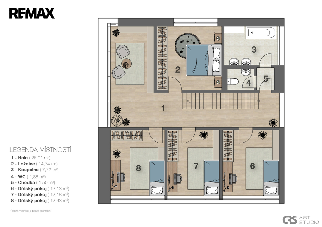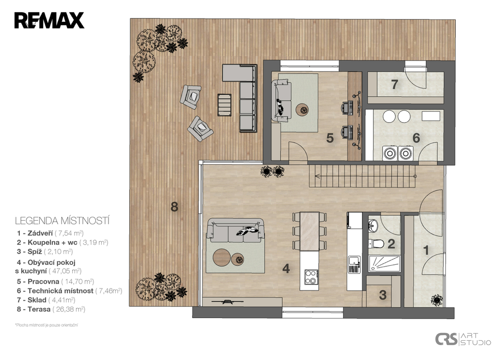 Interiér domu je navržen s důrazem na kvalitu a komfort a je vybaven nábytkem na míru, který vám poskytne dostatek úložného prostoru. Pohodlí pro celou rodinu zajistí efektivní rozdělení na společenskou zónu v přízemí a část s ložnicemi v patře. V přízemí najdete velkorysý obývací prostor s kuchyní, ze kterého je přímý vstup na venkovní zastřešenou terasu ideální pro odpočinek a posezení s rodinou a přáteli. Dále zde máte vstupní zádveří, komoru, pracovnu a technickou místnost. V patře pak najdete halu a 4 pokoje, které mohou sloužit jako ložnice, pokoje pro děti nebo hosty, či jako pracovna a šatna. V každém patře se nachází toaleta i koupelna a bezpečností skleněné sprchové zástěny mají úpravu proti zanechávání vody.