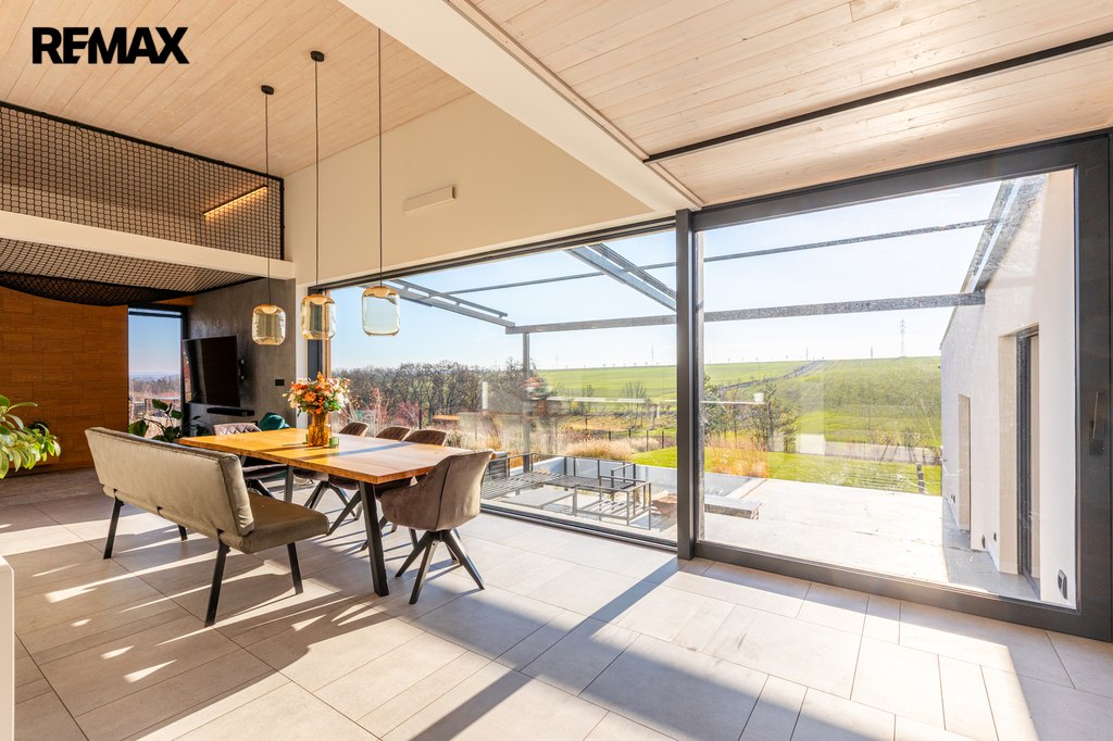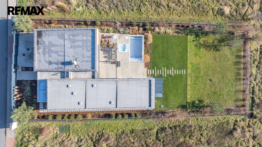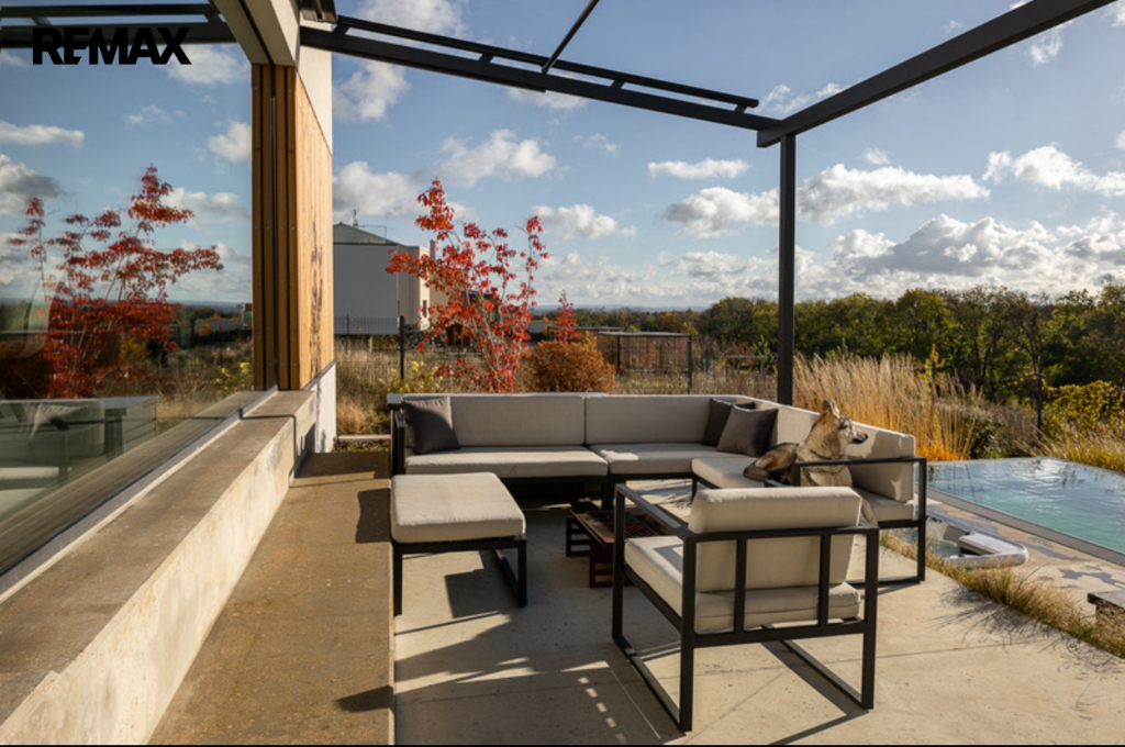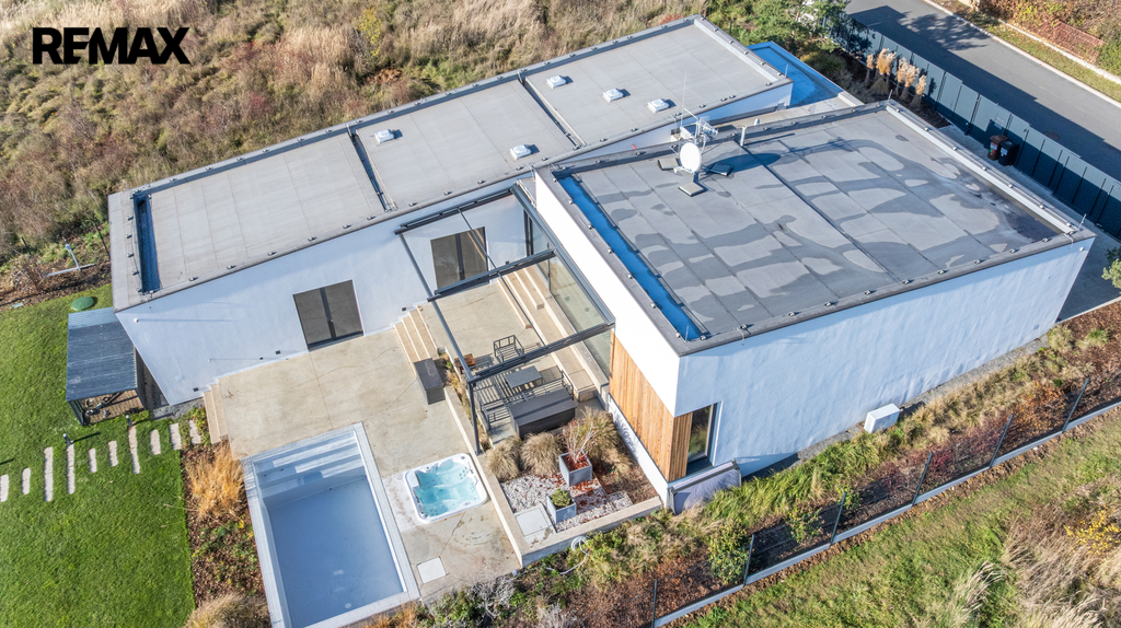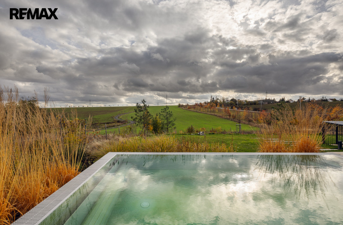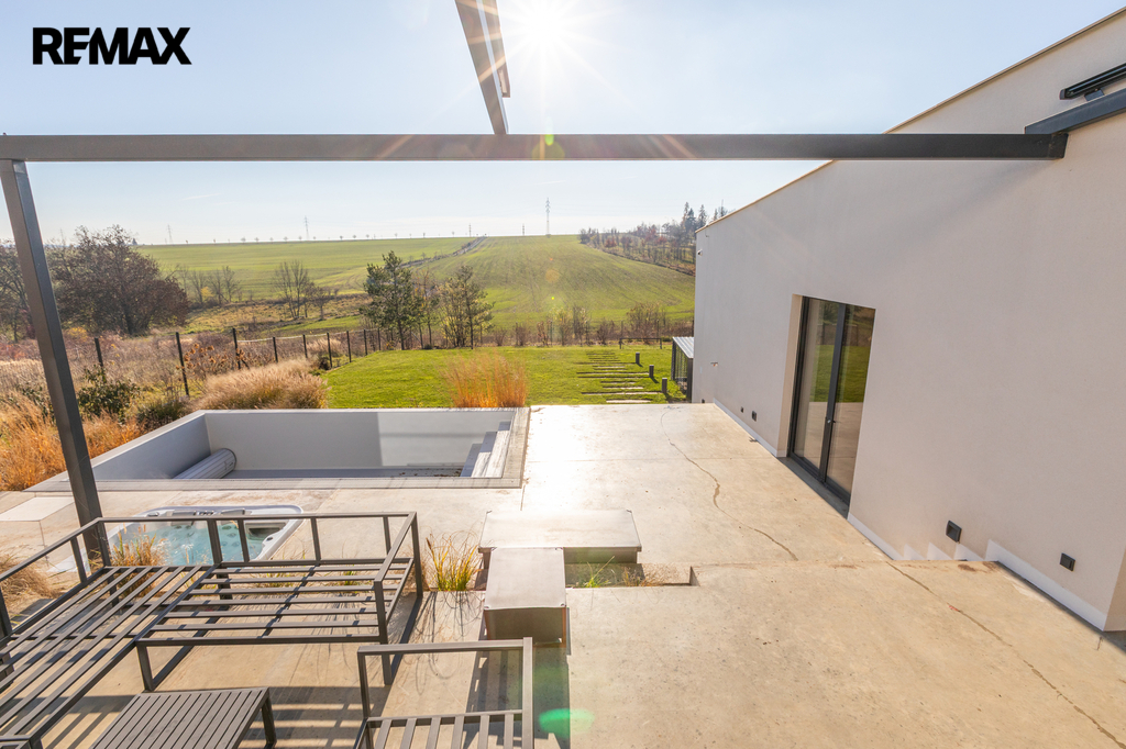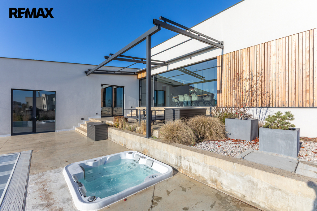 Terasy mají elektricky ovládané zastínění a zapuštěný přelivový bazén 6x3 s vyjíždějí krycí nosnou lamelou a vířivku, vše od firmy BWT.