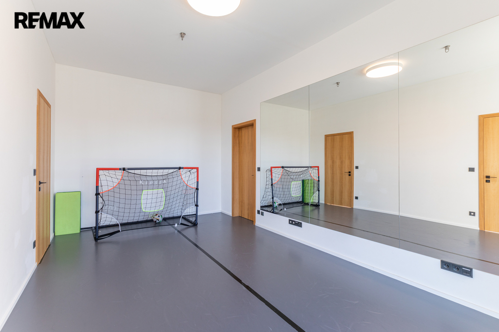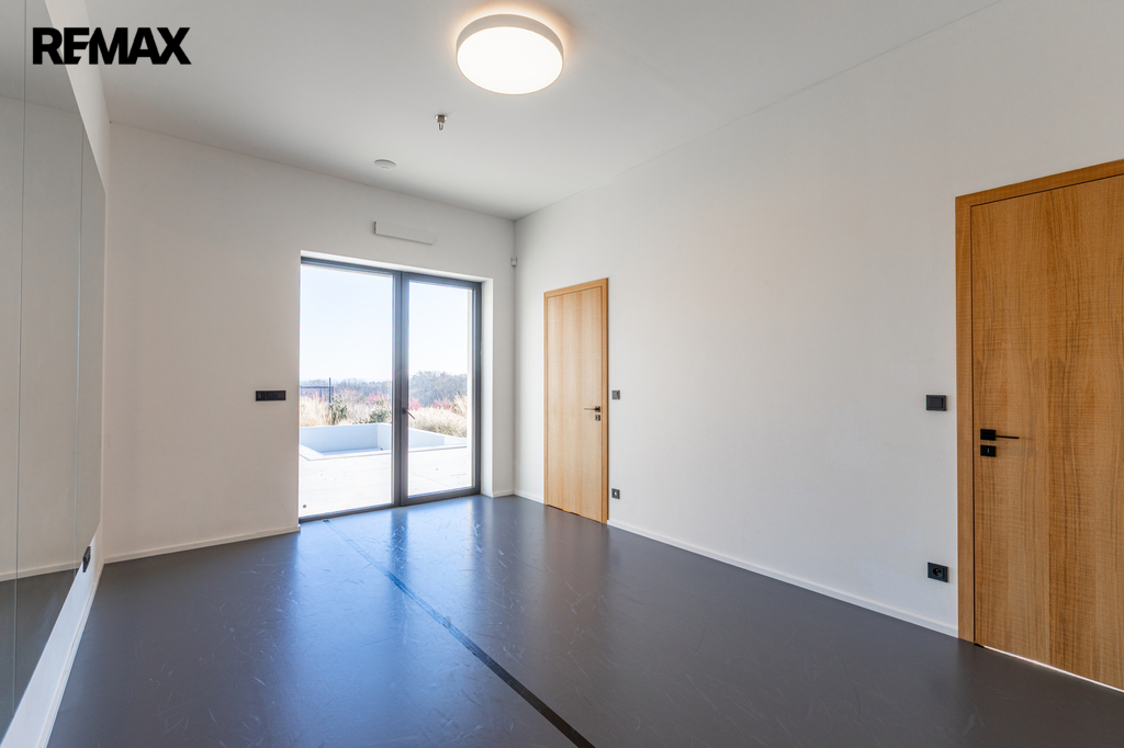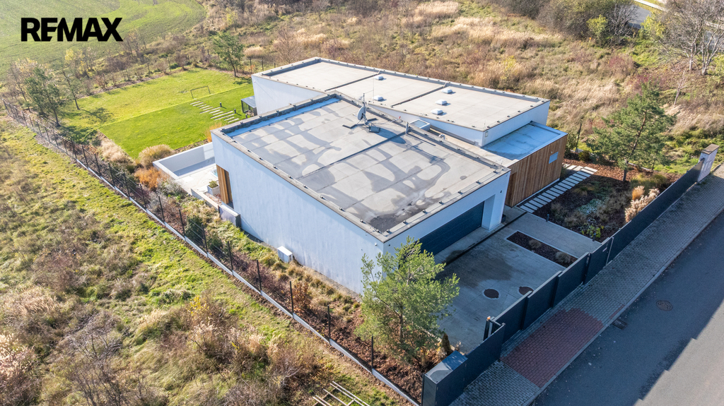 Jednopodlažní vila 6+kk s celkovou užitnou plochou 339 m2 (dům 246 m2 + terasa 29 m2 + terasa s bazénem a vířivkou 65 m2) má obývací (televizní pokoj) s navazující prostornou jídelnou a kuchyní (celkem o výměře 61 m2), hlavní ložnici se šatnou a koupelnou s WC, tři pokoje, koupelnu s WC, chodbu s vestavěnými skříněmi, tělocvičnu/hernu, garáž pro tři vozy (49 m2), technickou místnost a samostatné WC.