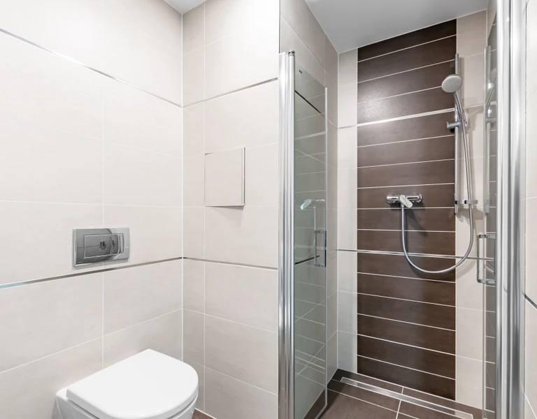 koupelna se sprchovým koutem, toaletou a pračkou