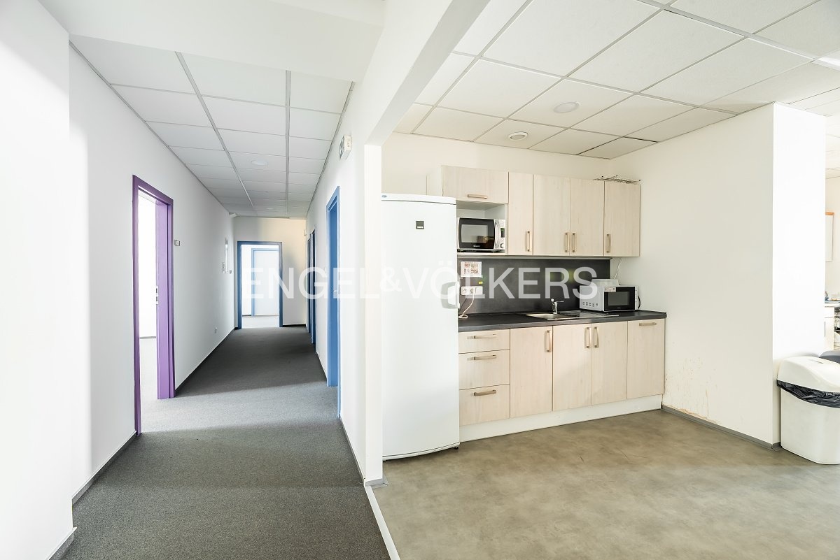 K dispozici je možnost pronájmu patra o velikosti 788 m2. Prostory jsou v současnosti rozděleny příčkami na samostatné kanceláře a jídelní místnost s kuchyňskou linkou, která je plně vybavena lednicí, mikrovlnnou troubou a myčkou na nádobí.