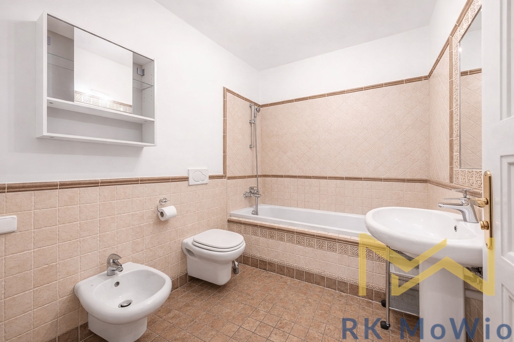 Bytová jednotka disponuje vstupní chodbou, prostorným obývacím pokojem s jídelní částí, samostatnou kuchyní, koupelnou (s vanou, umyvadlem, toaletou a bidetem) a druhou koupelnou (se sprchovým koutem, umyvadlem, toaletou a bidetem). Vybavení bytu: kuchyňská linka (včetně lednice s mrazákem, sklokeramické varné desky, digestoře, myčky a elektrické trouby), vestavěné skříně, pračka a sušička, příprava pro vysokorychlostní internet.