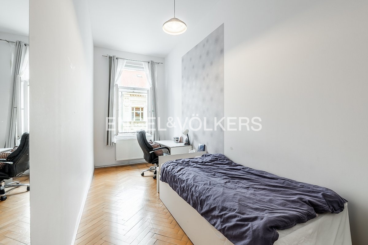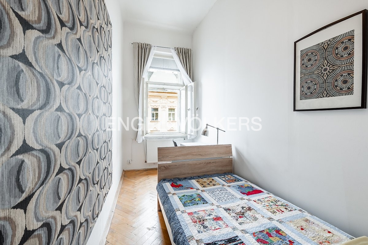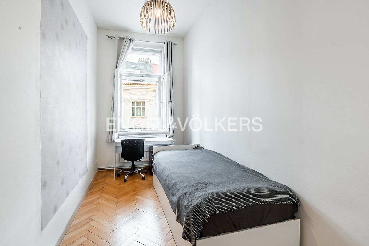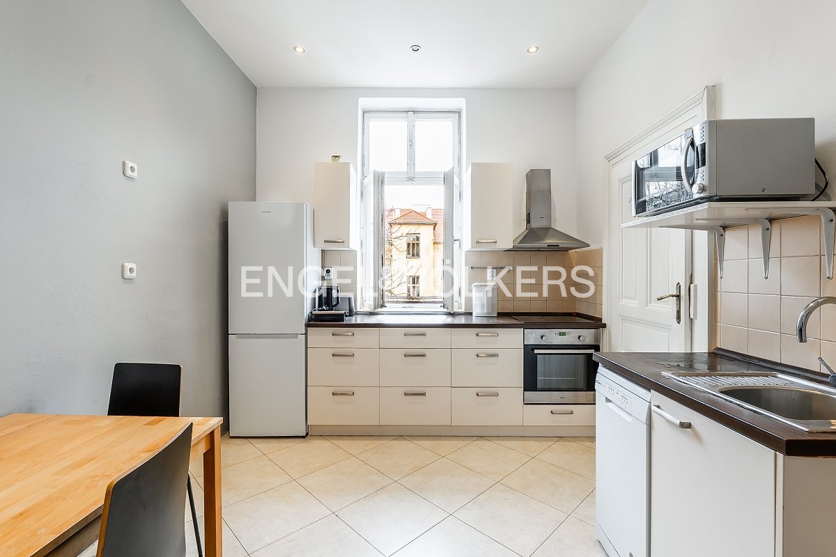 Byt prošel rekonstrukcí v roce 2001 a v roce 2015 byl dispozičně upraven do současného řešení. V původní dispozici 3+1 zaujmou impozantní stropy výšky 3,7 m, zachované původní parkety a interiérové dveře – prvky, které dodávají prostoru nezaměnitelný charakter. Pro účely pronájmu je byt aktuálně uspořádán jako 6+1 se dvěma koupelnami.