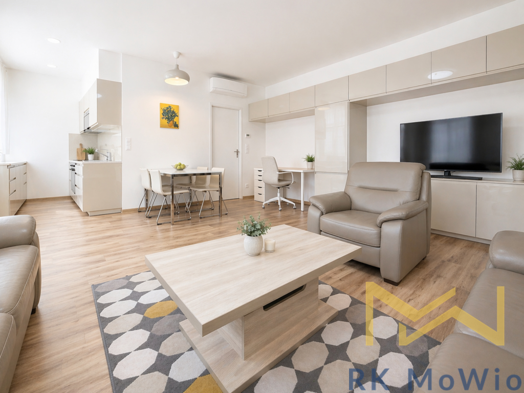 Dispozici bytové jednotky tvoří vstupní chodba, prostorný obývací pokoj s plně vybaveným kuchyňským koutem a jídelní částí, jedna ložnice s vlastní koupelnou (sprchový kout, umyvadlo), samostatná toaleta a technická místnost. Vybavení bytu: kuchyňská linka (včetně lednice s mrazákem, sklokeramické varné desky, digestoře, myčky a elektrické trouby), vestavěné skříně, klimatizace, pračka a sušička. K bytu náleží sklep.