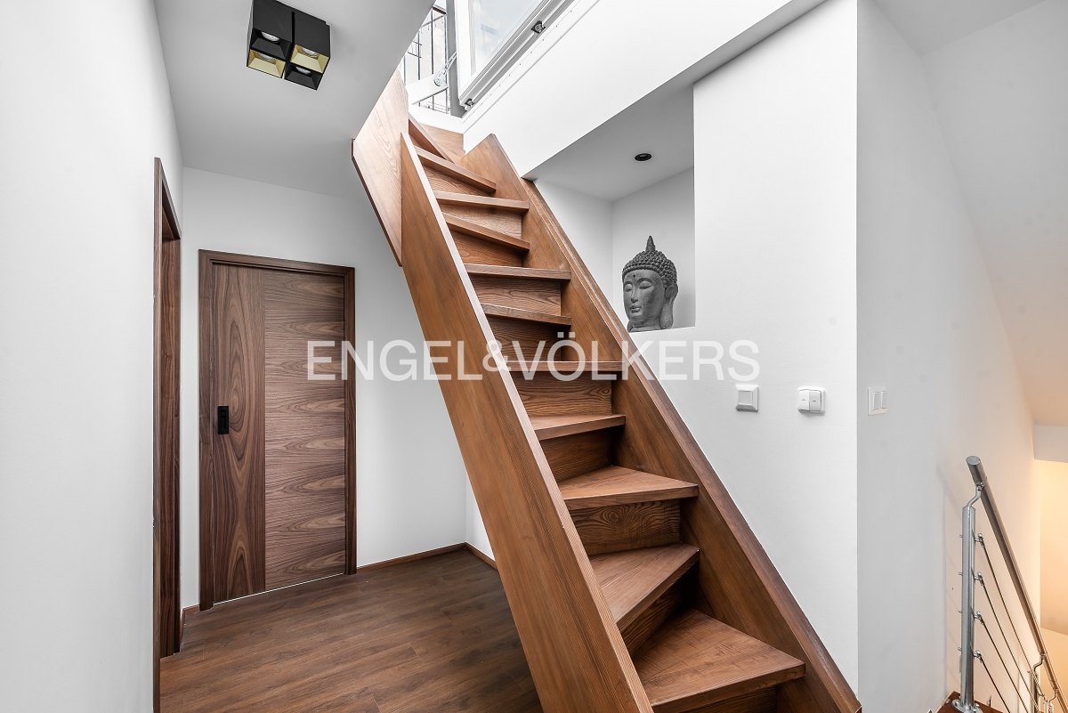Srdcem celého bytu je prostorný obývací pokoj s plynovým krbem a kvalitní sedací soupravou, který plynule navazuje na jídelní část a kuchyňský kout. Kuchyně je vybavená všemi spotřebiči, mimo jiné americkou lednicí a vinotékou. Ve vyšším patře mezonetu je ložní část, dvě ložnice s manželskou postelí a úložnými prostory. Z hlavní ložnice je vstup na balkon. Koupelna disponuje sprchovým koutem a vanou, toaleta je samostatná. Při vstupu do bytu je další samostatná toaleta, v bytě se dále nalézá množství úložných prostor a technická místnost. Z horního patra bytu je automatické schodiště, které umožňuje vstup na prostornou střešní terasu, která nabízí výhledy na okolí.