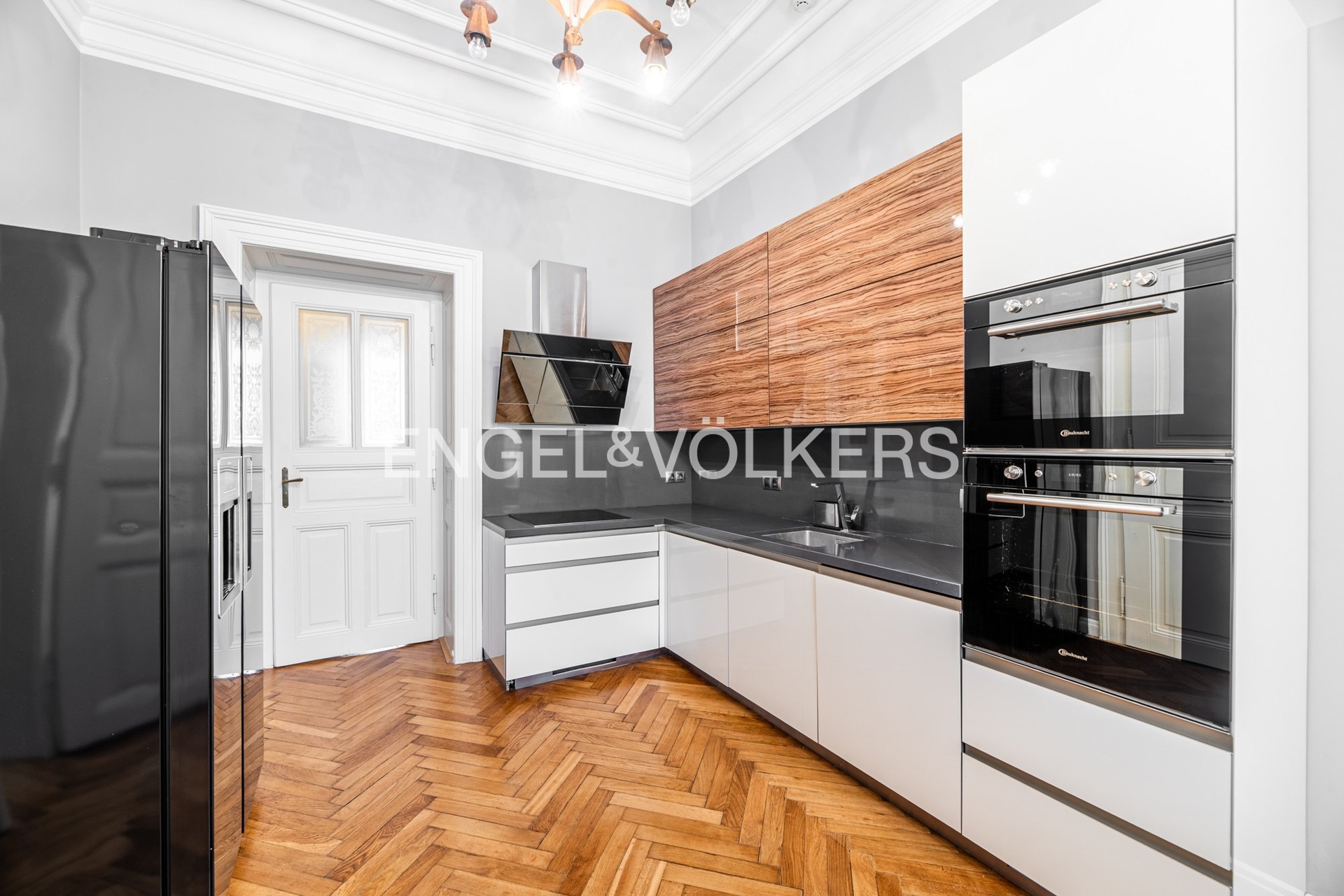 Dispozici bytu tvoří prostorná vstupní hala, samostatná plně vybavená kuchyň, obývací pokoj, ložnice se solitérní vanou a vstupem na balkon, který je orientován do klidného vnitrobloku. Dále je zde koupelna se sprchou a toaletou a také technická místnost s pračkou a sušičkou. V interiéru byly použity vysoce kvalitní materiály – nové dřevěné parkety, štuky, kazetové dveře, stylová svítidla a plně funkční historická kachlová kamna. Byt je vybaven moderním bezpečnostním systémem včetně alarmu, videotelefonu a kamerového systému.