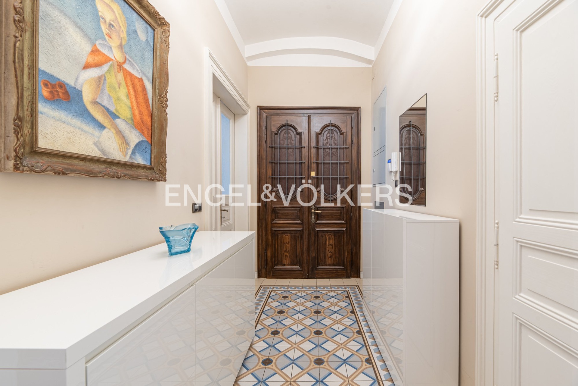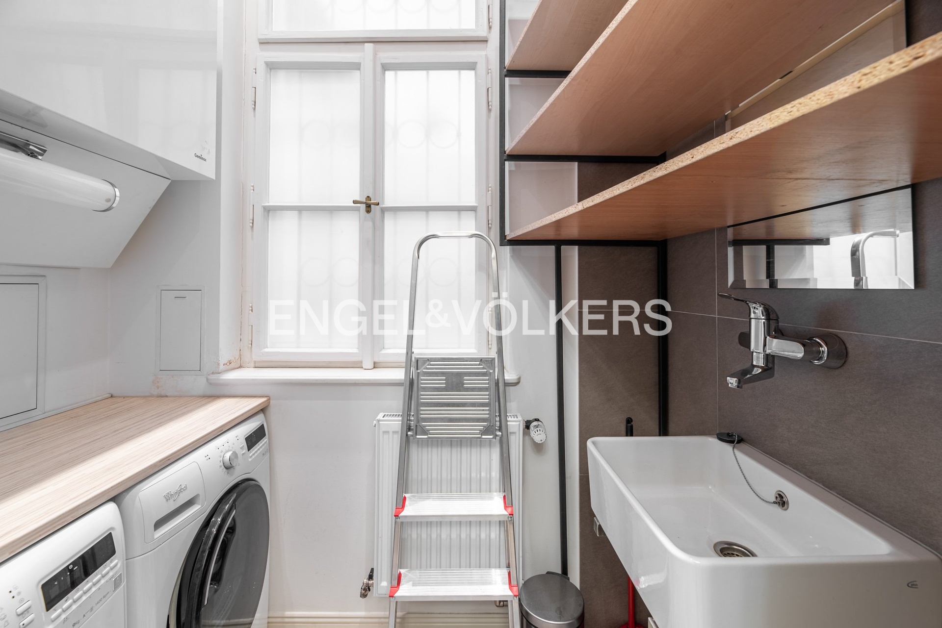 Byt se nachází ve čtvrtém nadzemním podlaží zrenovovaného secesního domu s moderním výtahem přímo v srdci historického centra Prahy. Interiér kombinuje původní architektonické prvky s důrazem na kvalitu materiálů, historický charakter a moderní technologie.