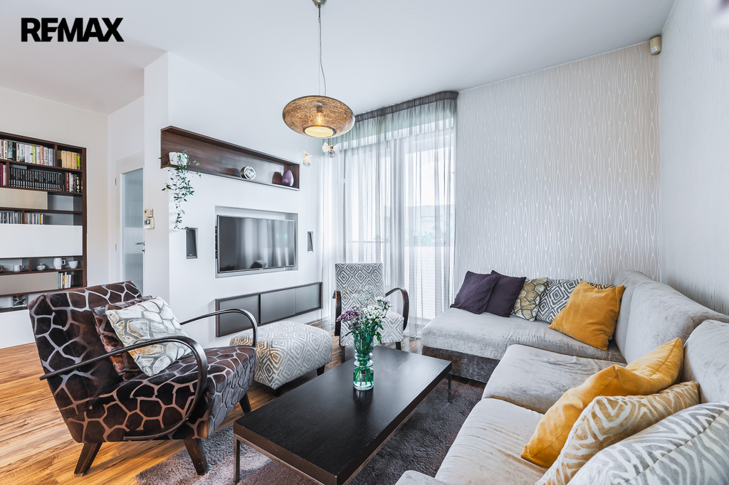 Celý interiér (kromě kuchyně a toalet) je realizován na míru podle návrhu bytového architekta Tomáše Marxe, včetně drobných stavebních úprav – vestavěné skříně a nábytek propojují funkčnost s estetikou.
