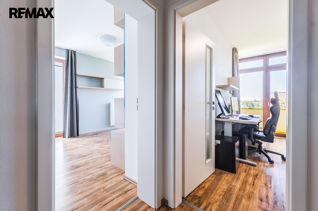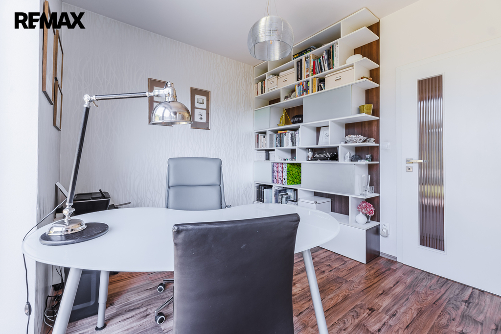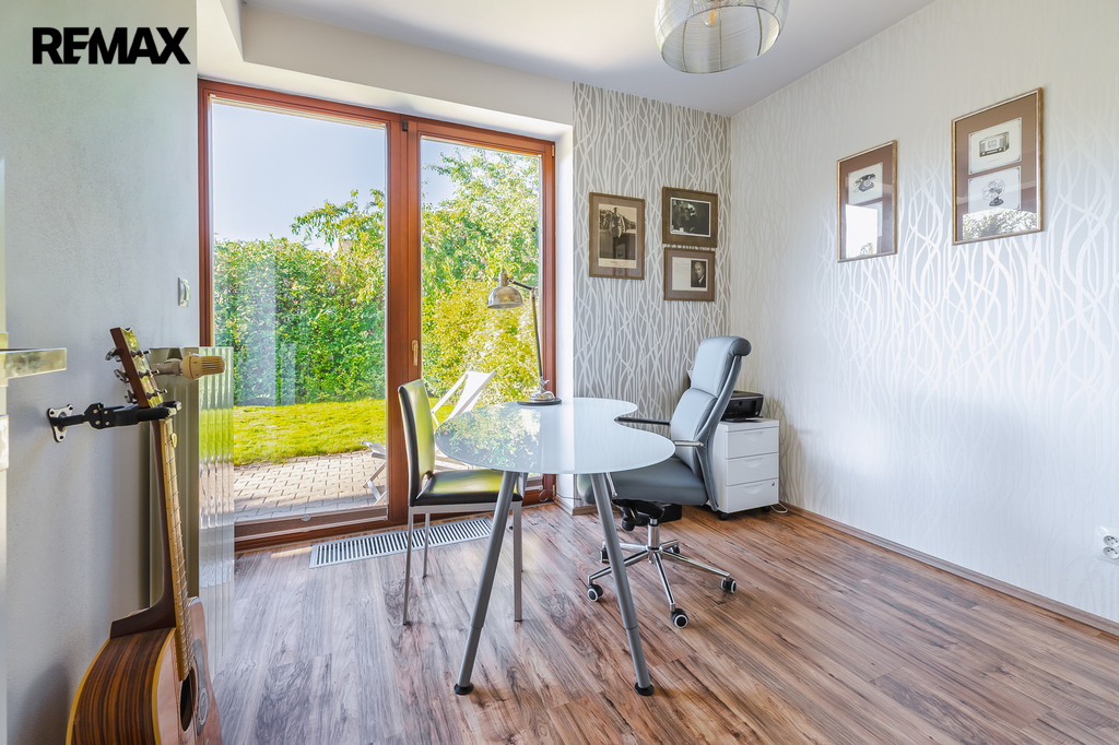 Pokoj využívaný jako pracovna, s přímým vstupem na terasu