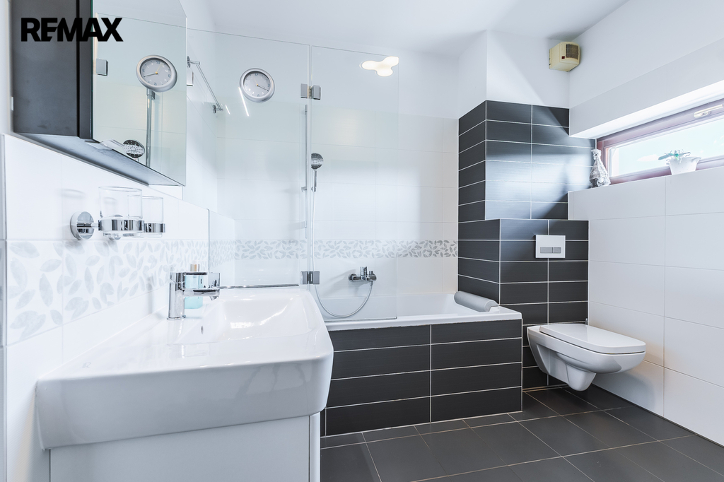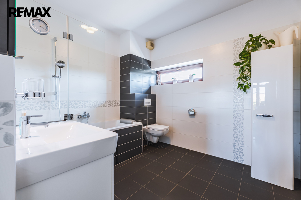 Velká koupelna s oknem, vanou a sprchovou zástěnou a wc