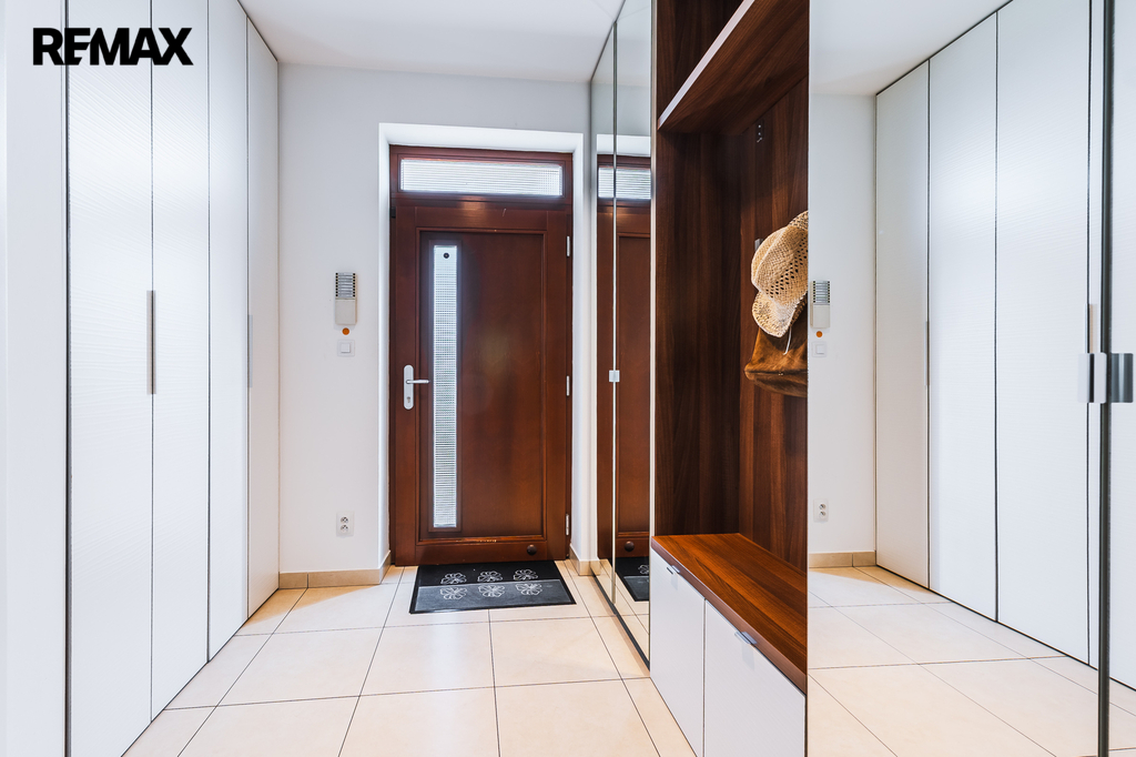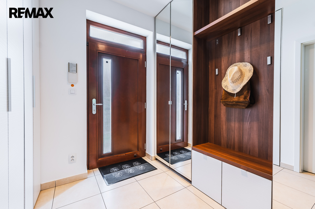 Prostorná vytápěná předsíň s vestavěnými skříněmi na míru, průchozí z garáže i z ulice