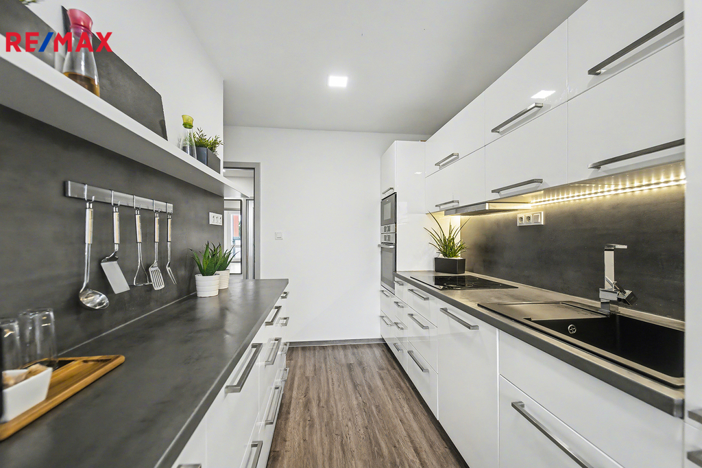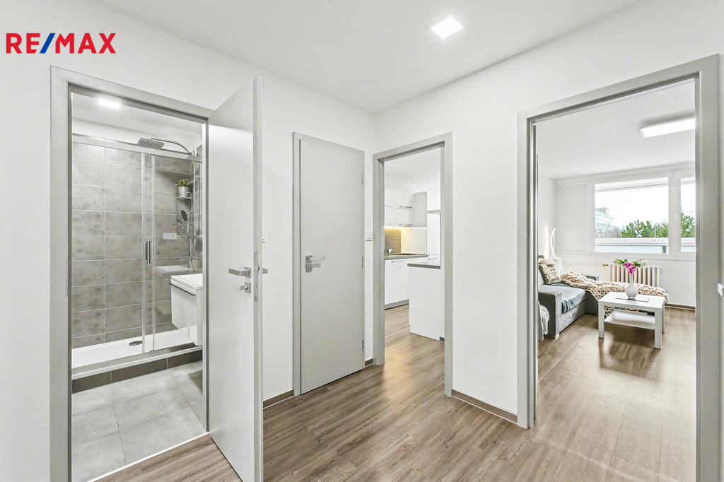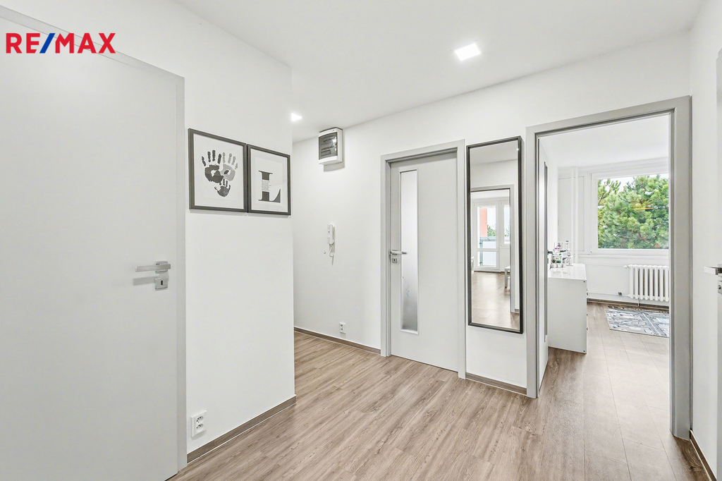 Dispozice bytu nabízí praktické rozdělení prostoru: obývací pokoj se vstupem na lodžii, kuchyně s jídelním koutem, dva samostatné pokoje, předsíň s úložným prostorem, koupelna se sprchovým koutem, samostatné WC, komora v bytě, sklepní kóje. Byt prošel rozsáhlou, moderní a velmi zdařilou rekonstrukcí v roce 2018 (vinylové podlahy a dlažba, kuchyň, koupelna, elektroinstalace v mědi). Kuchyň byla vyrobena na míru a je vybavena kvalitními spotřebiči – indukční varná deska, trouba, mikrovlnná trouba, myčka, digestoř i lednice s mrazákem. Nechybí dostatek pracovní i úložné plochy.