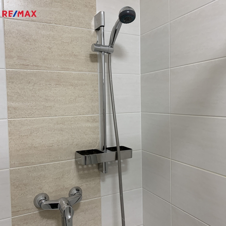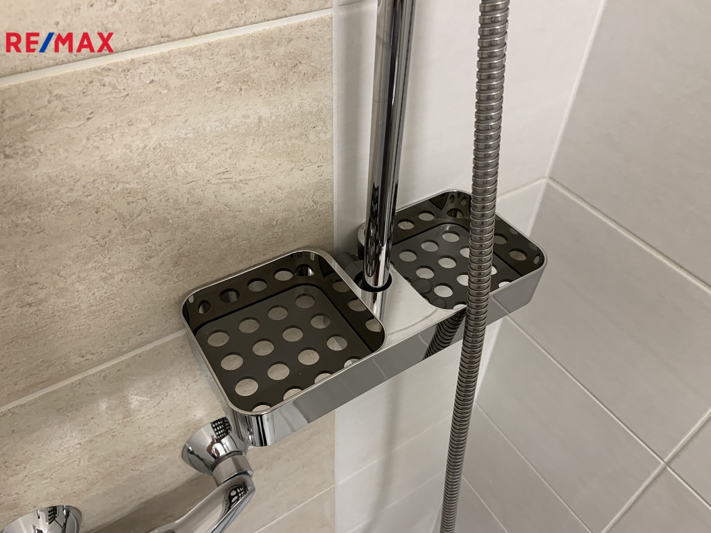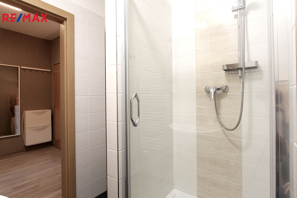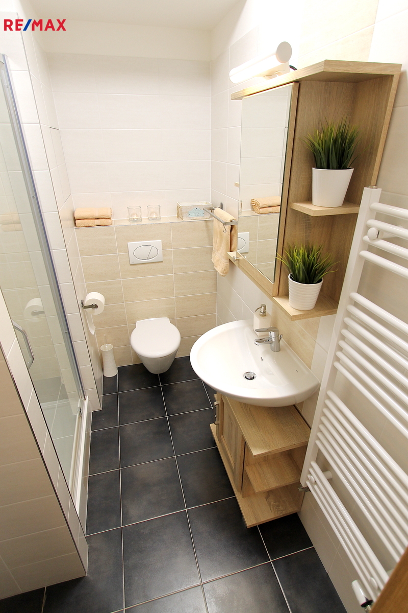 Koupelna je vybavena sprchovým koutem v nice, závěsným WC, koupelnovým nábytkem a pračkou Whirlpool (2020).