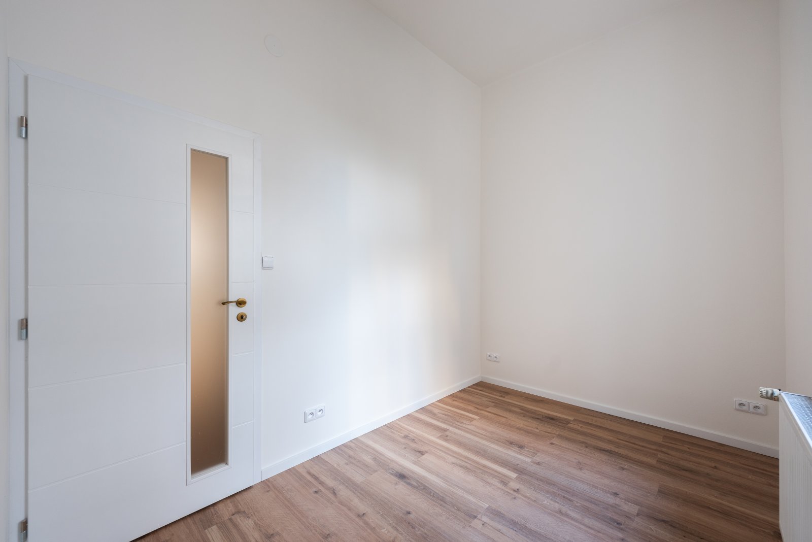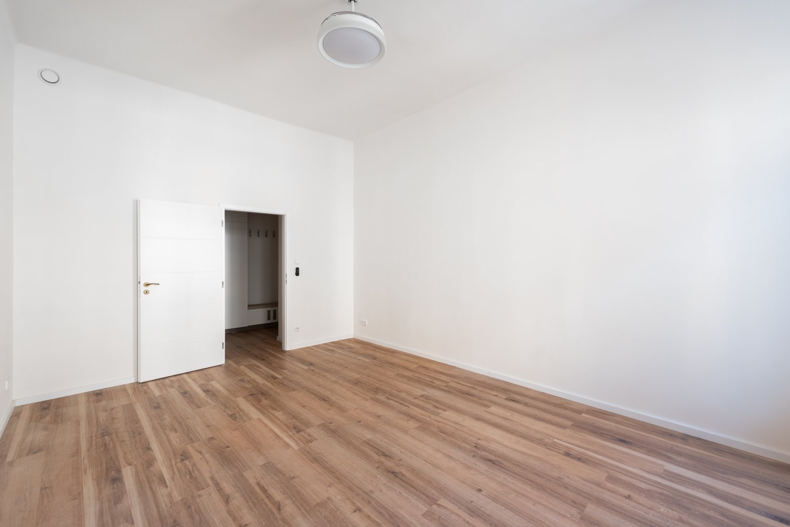 Zadní část bytu je orientovaná do klidného vnitrobloku a tvoří ji ložnice rodičů, ze které se vstupuje do samostatné místnosti, která může být zároveň pracovnou, šatnou i úložným prostorem. Díky šoupacím dveřím, připraveným rozvodům a chytře řešené komoře je tento prostor už teď plně připravený na jakékoli využití — kombinace home office a velkorysé rodinné šatny.