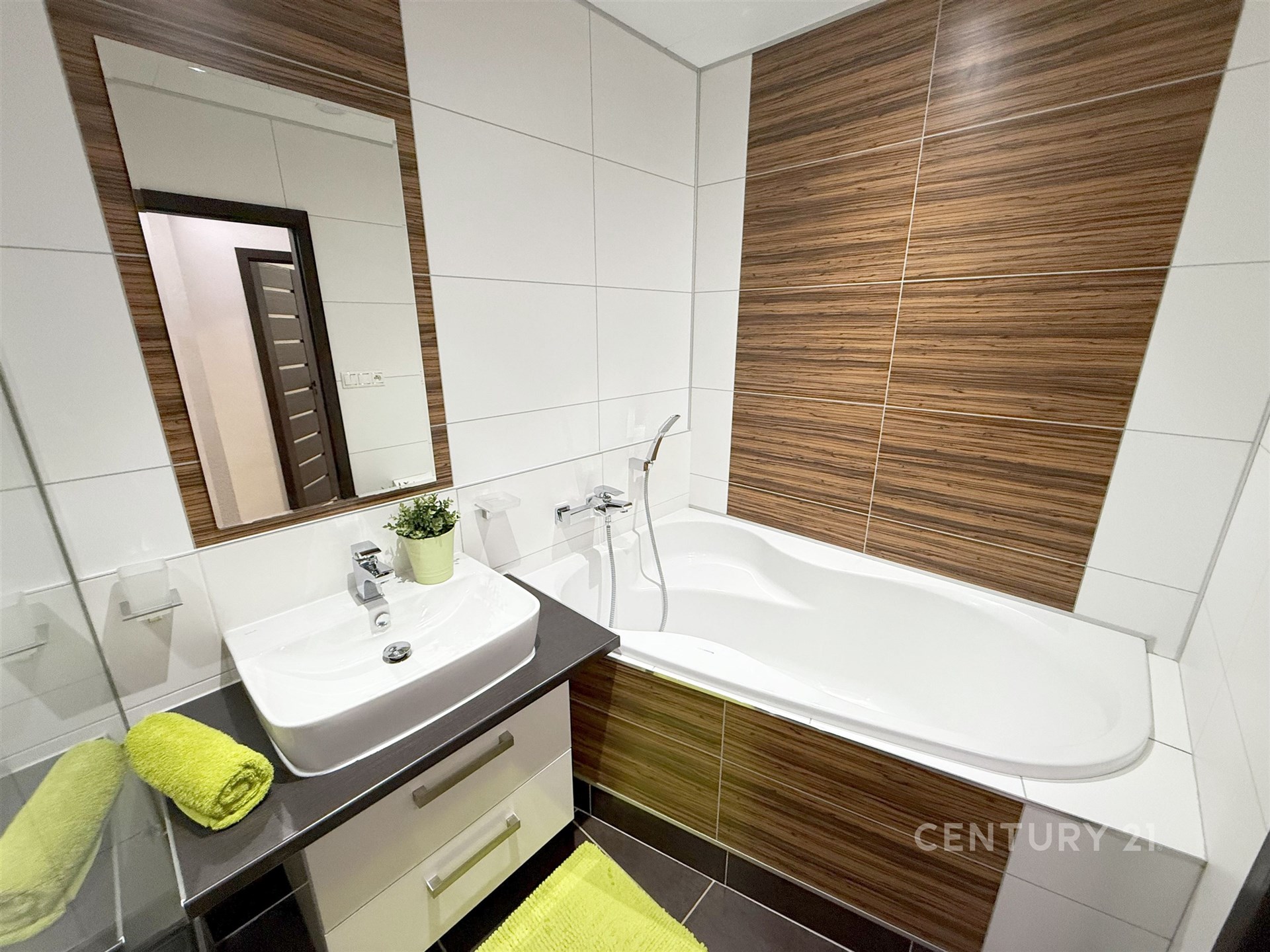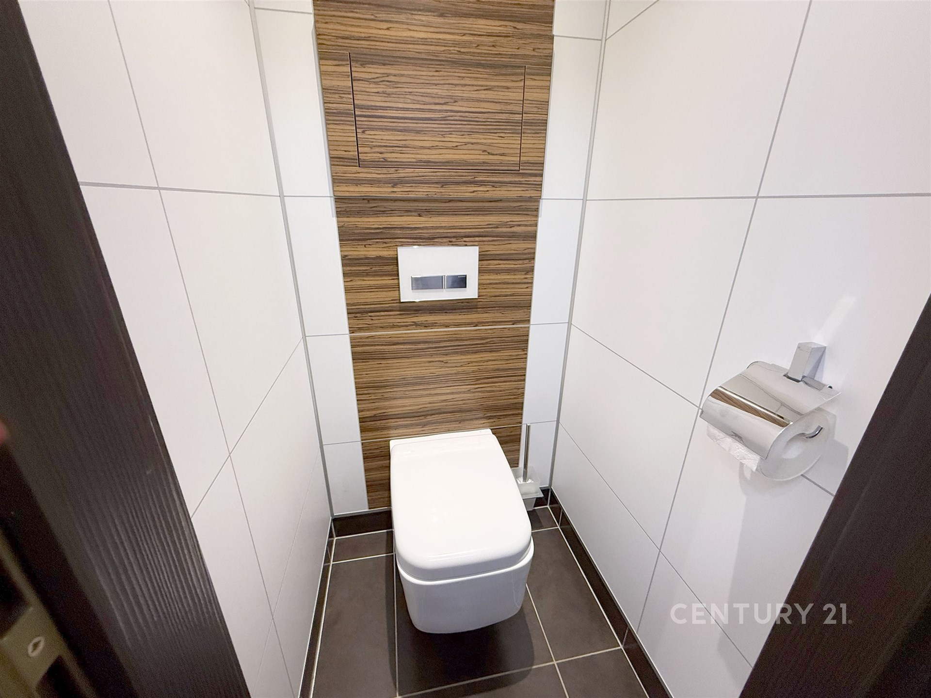Nadstandardně velká koupelna v elegantním provedení je vybavená jak rohovou vanou, tak i prostorným sprchovým koutem. WC je samostatné.