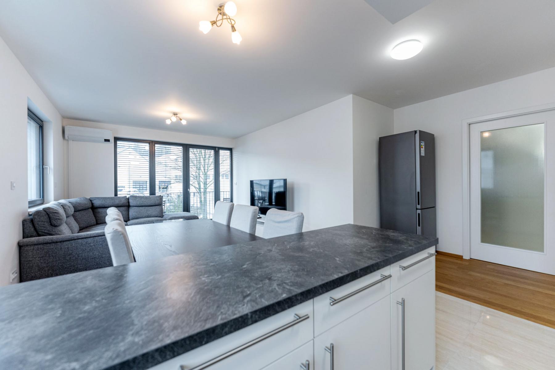 Dispozice: vstupní chodba, obývací pokoj s kuchyňským koutem a vstupem na terasu, 3 ložnice (jedna s balkonem), 2 koupelny (vana i sprchový kout), samostatná toaleta, komora. Vestavné skříně, pračka, sušička, klimatizace.